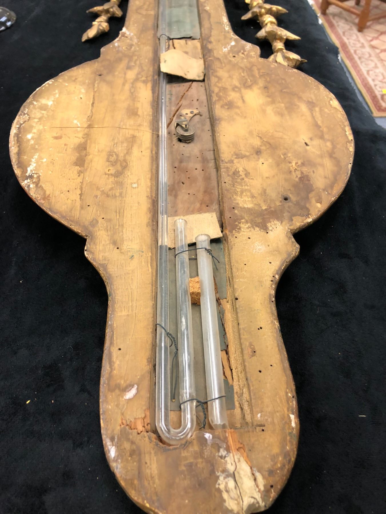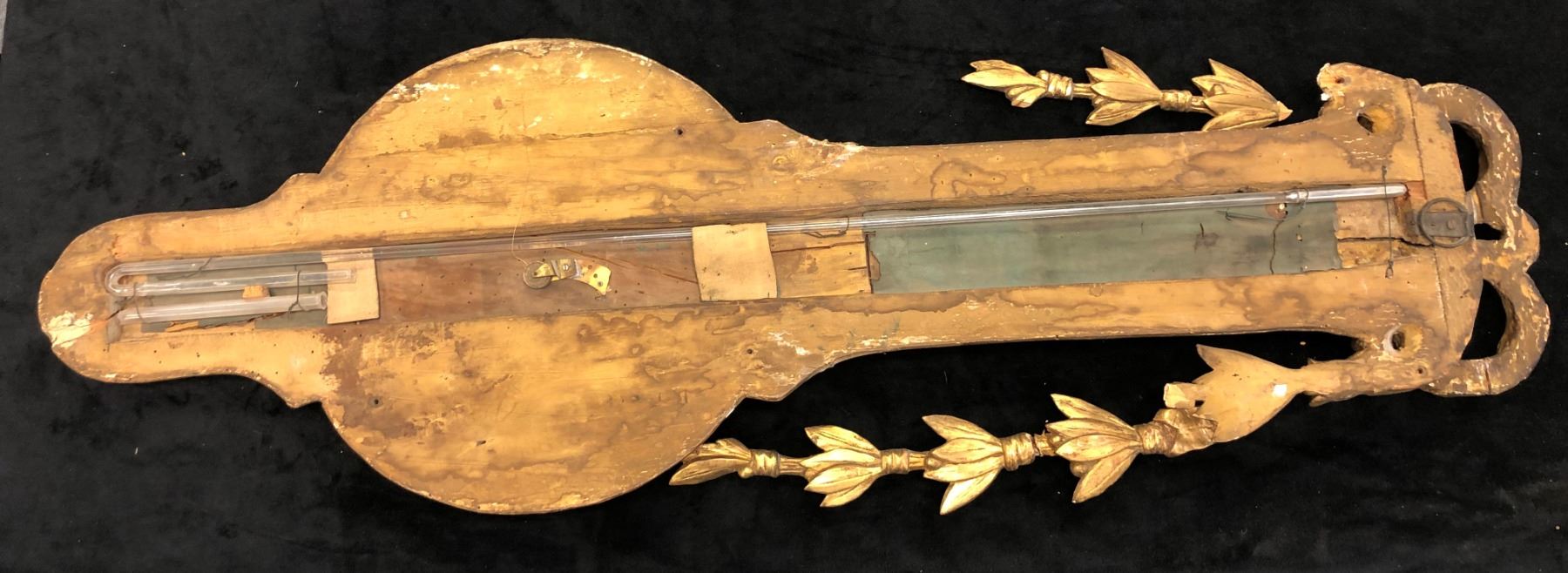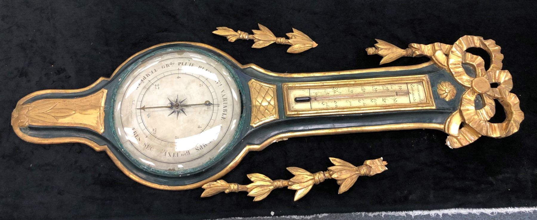 100+ years old gilded large barometer/ thermometer - Robert Oplician Paris, France (green w/ gilded finish) (2 breaks to hanging gold leaves)
