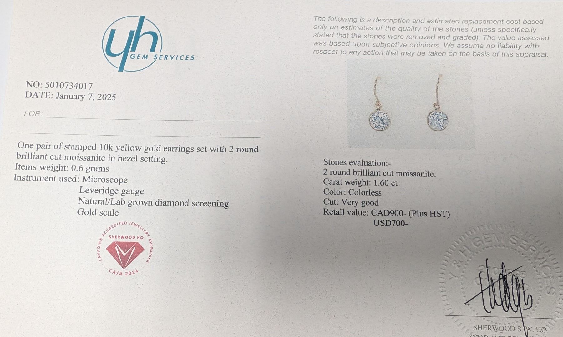 10K(0.6G), MOISSANITE (1.6CT) EARRING , APPRAISED INSURANCE VALUE $900