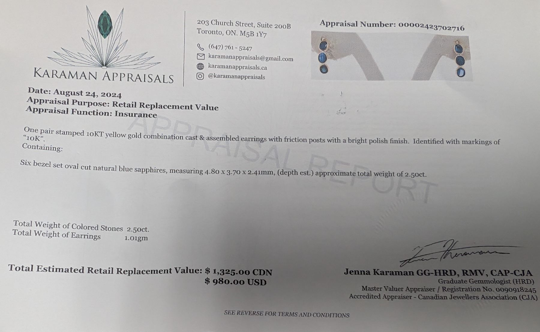 10K(1.01G), SAPPHIRE (2.5CT) EARRING , APPRAISED INSURANCE VALUE $1325
