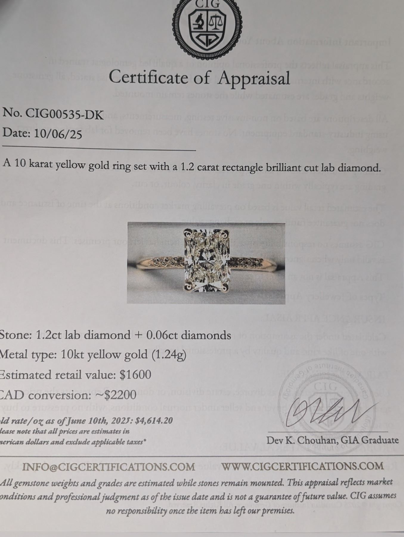 10K(1.24G), LAB DIAMOND (1.2+0.06CT)RING, SIZE 6.5, APPRAISED INSURANCE VALUE $2200