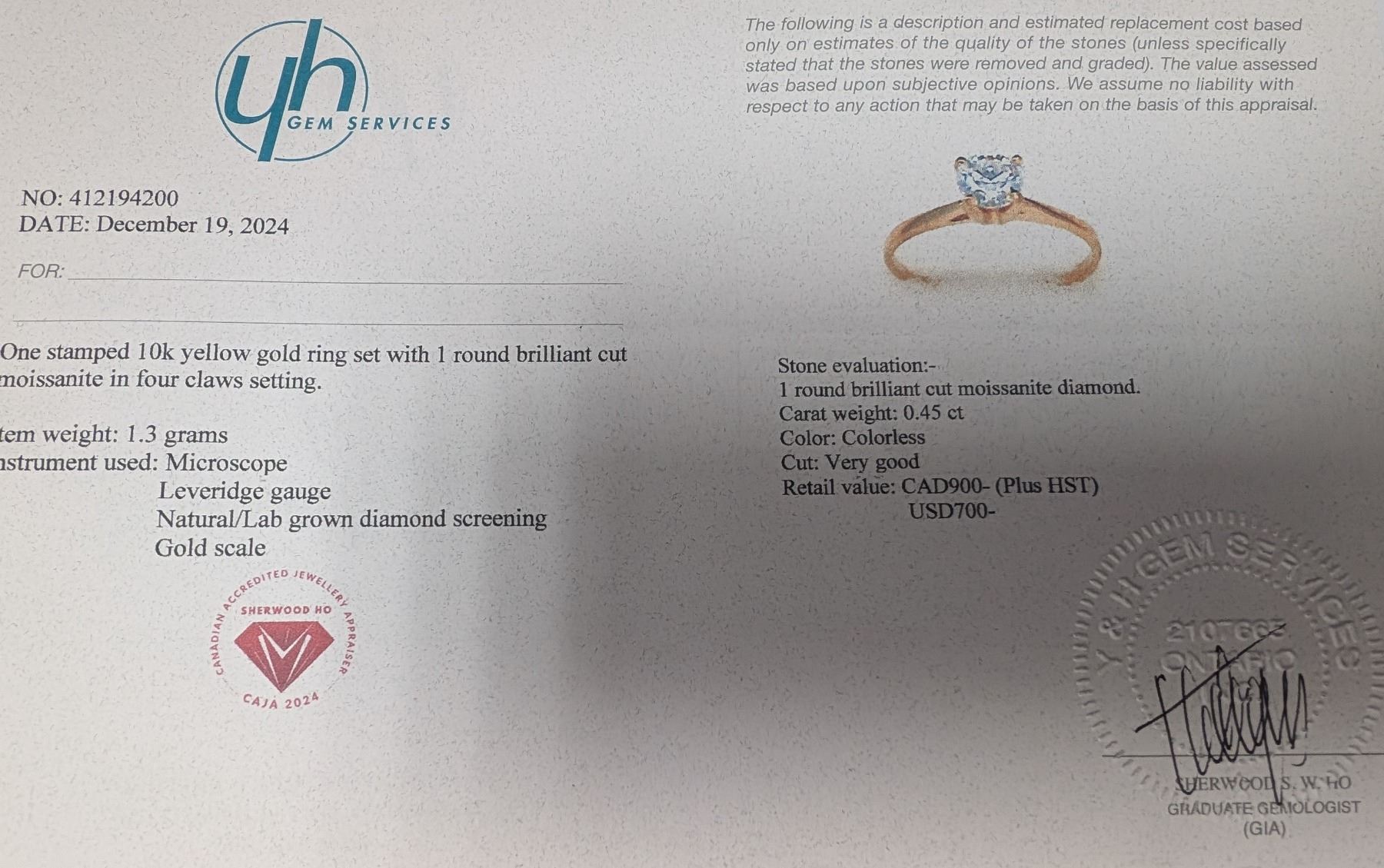 10K(1.3G), MOISSANITE (0.45CT) RING, APPRAISED INSURANCE VALUE $900