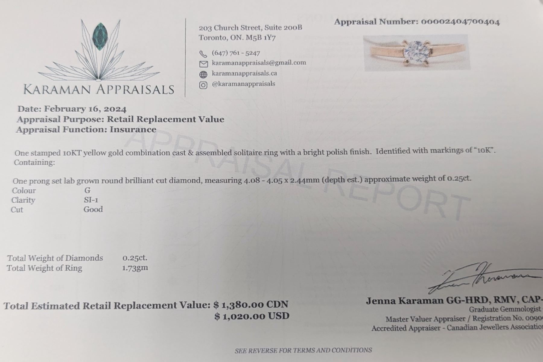 10K(1.73G), LAB DIAMOND (0.25CT) RING, APPRAISED INSURANCE $1380