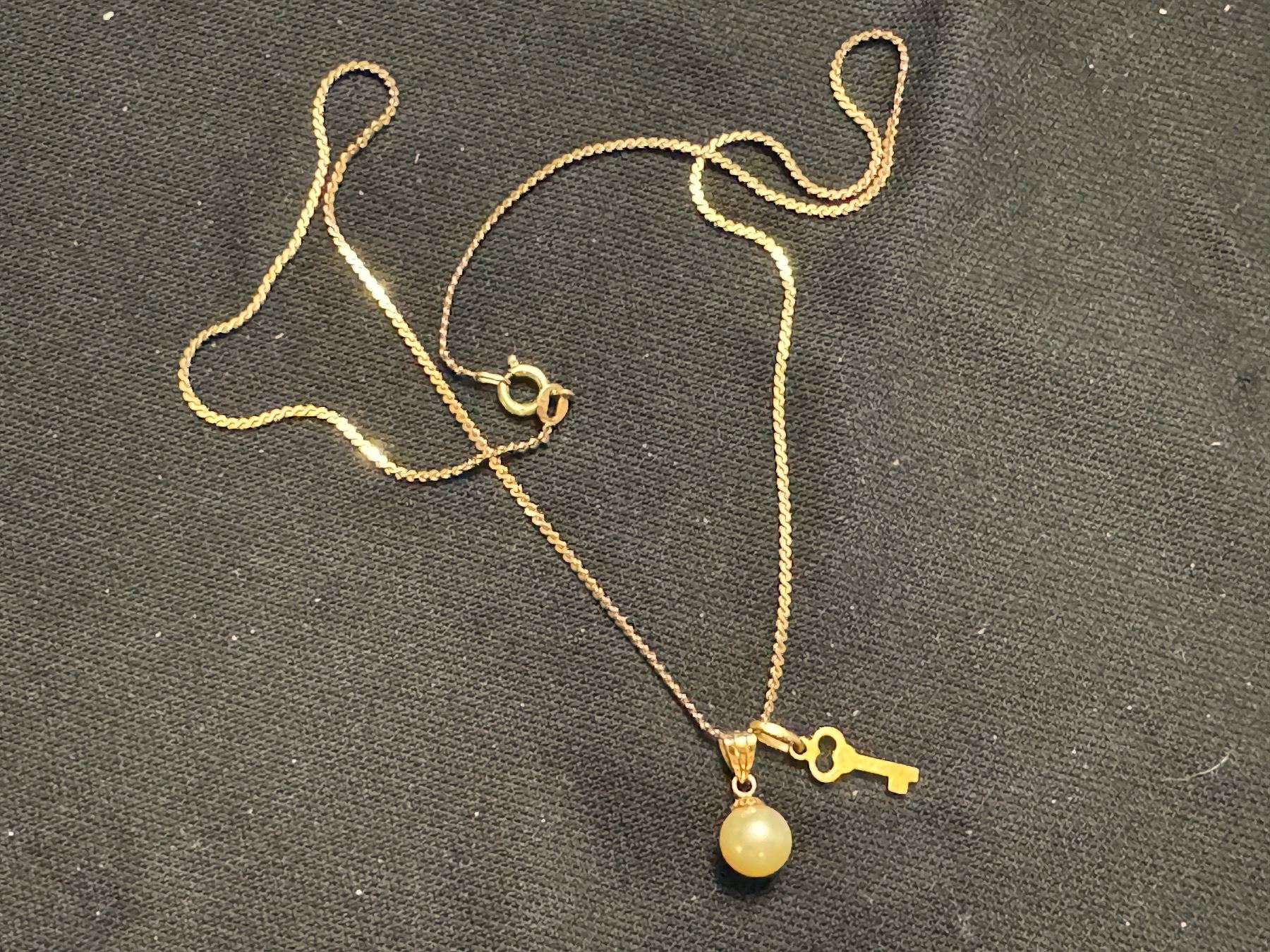 10K 16" CHAIN WITH 10K KEY PENDANT, AND 18K PENDANT WITH PEARL 3.4 GRAMS