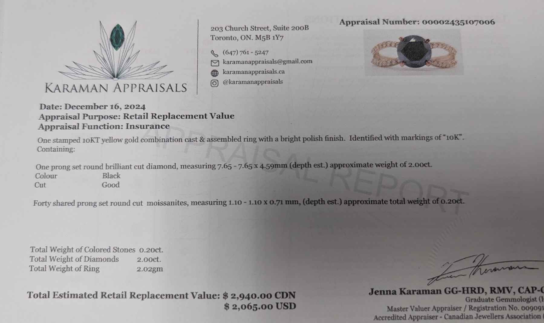 10K(2.02G), BLACK DIAMOND+MOISSANITE (2.2CT) RING, APPRAISED INSURANCE VALUE $2940