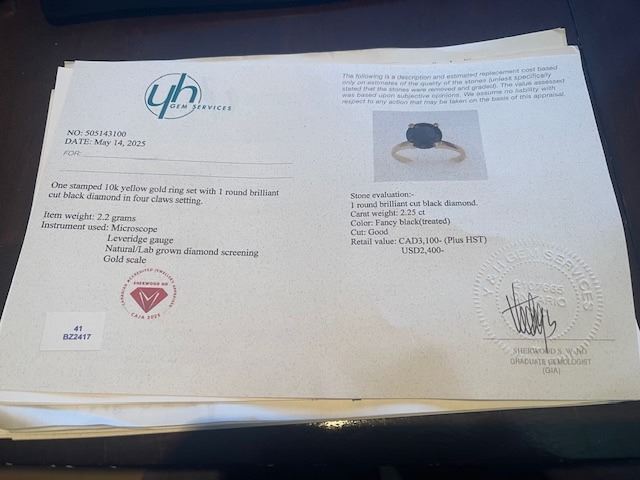 10K(2.2G), BLACK DIAMOND (2.25CT)RING, SIZE 6, APPRAISED INSURANCE VALUE $3100