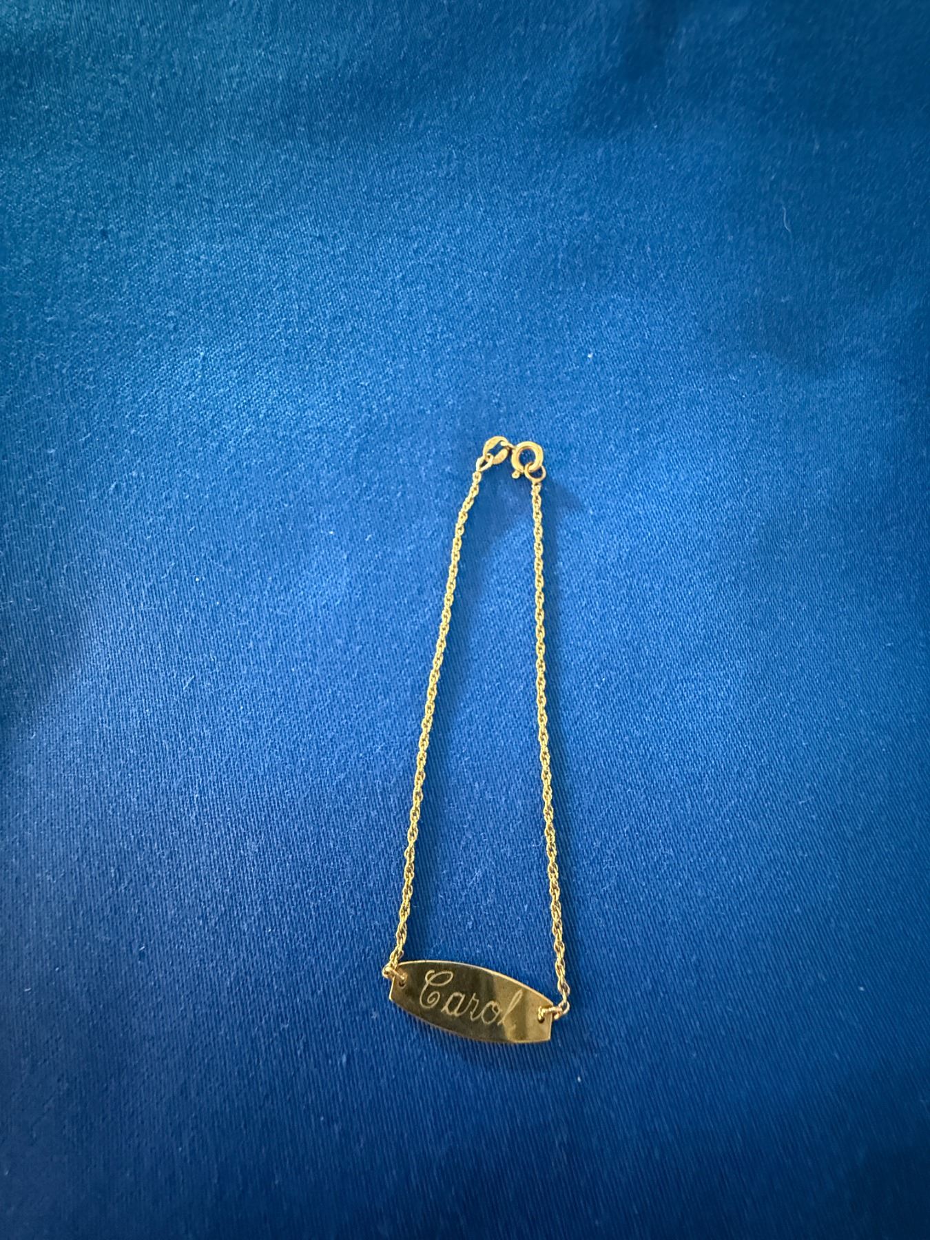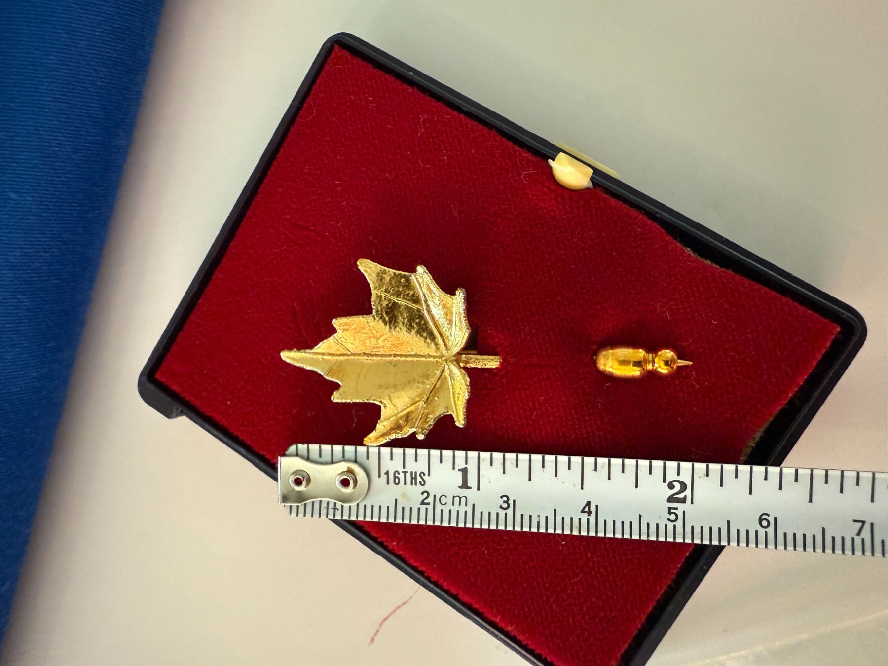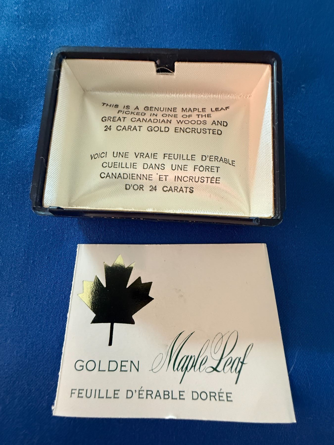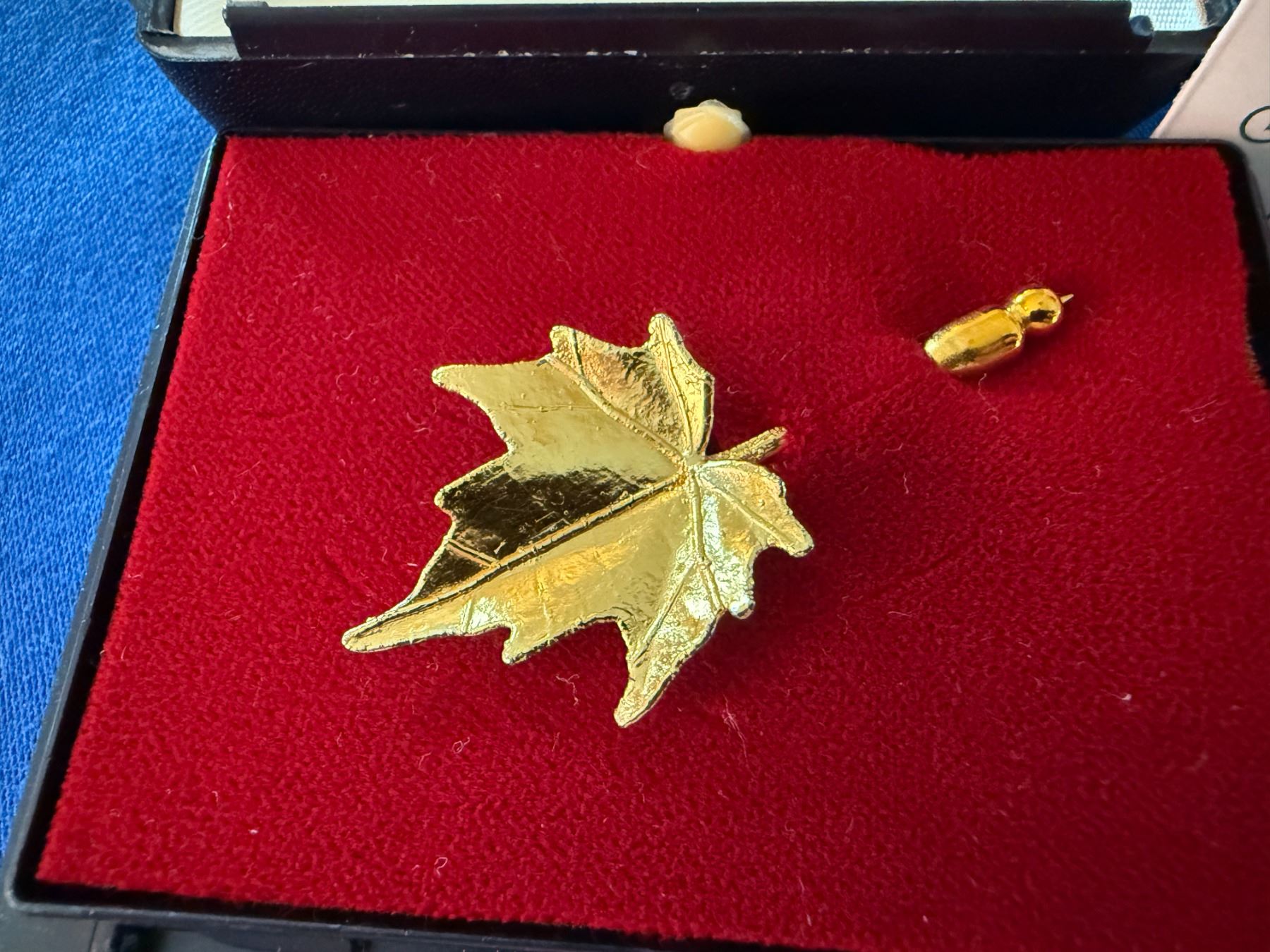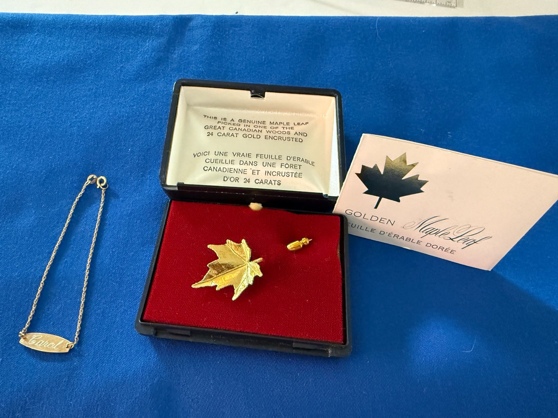 10K gold bracelet "Carol". 24 carat gold encrusted maple leaf pin/brooch.