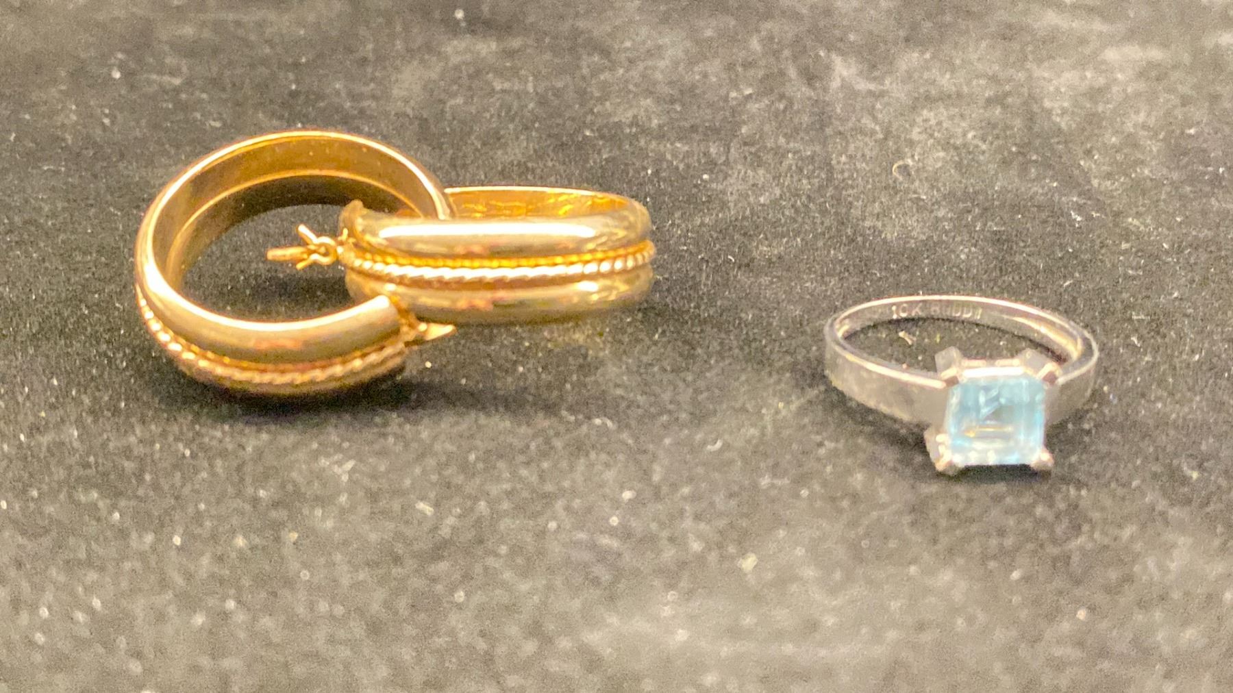 10K LADIES RING SET WITH AQUAMARINE, PAIR 10K HOOP EARRINGS (7.7G TOTAL)