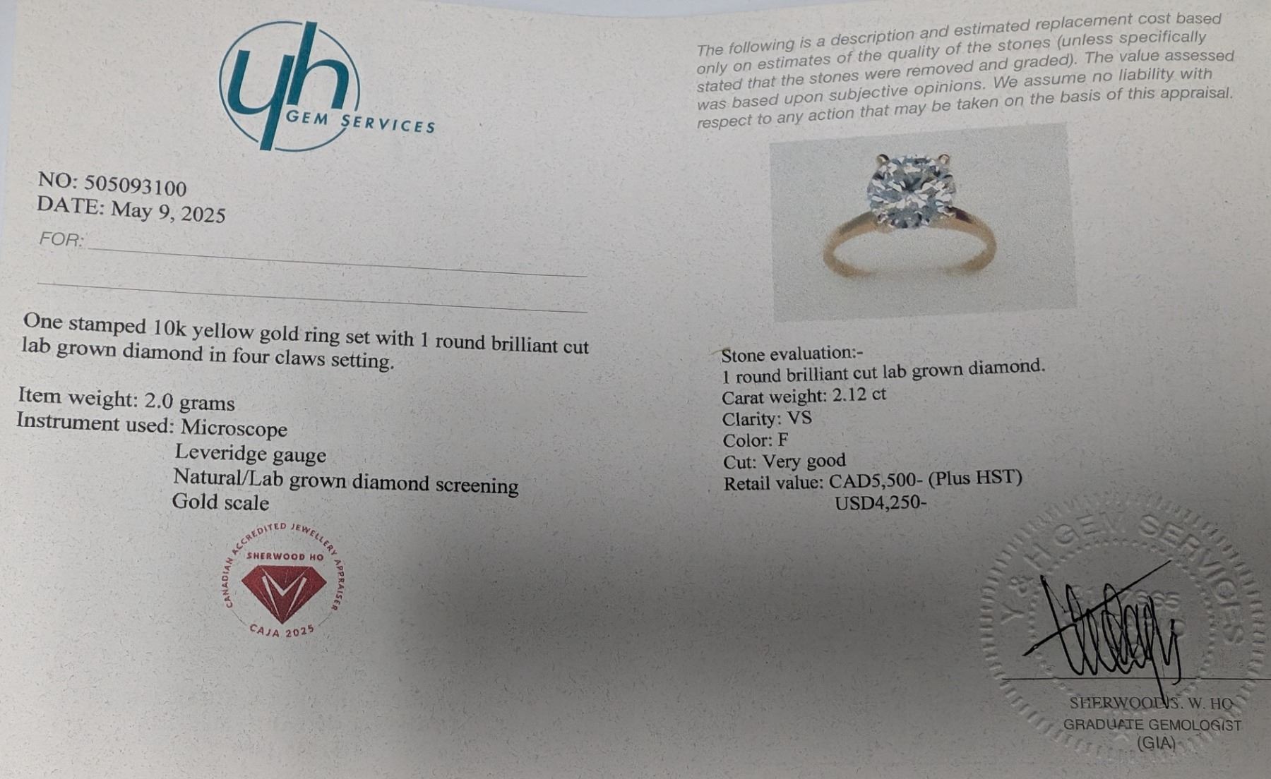 10K YELLOW GOLD 2G LAB DIAMOND 2.12CT RING APPRAISED INSURANCE VALUE $5500