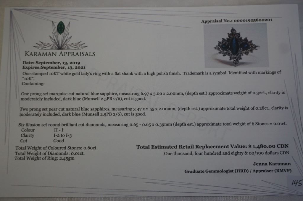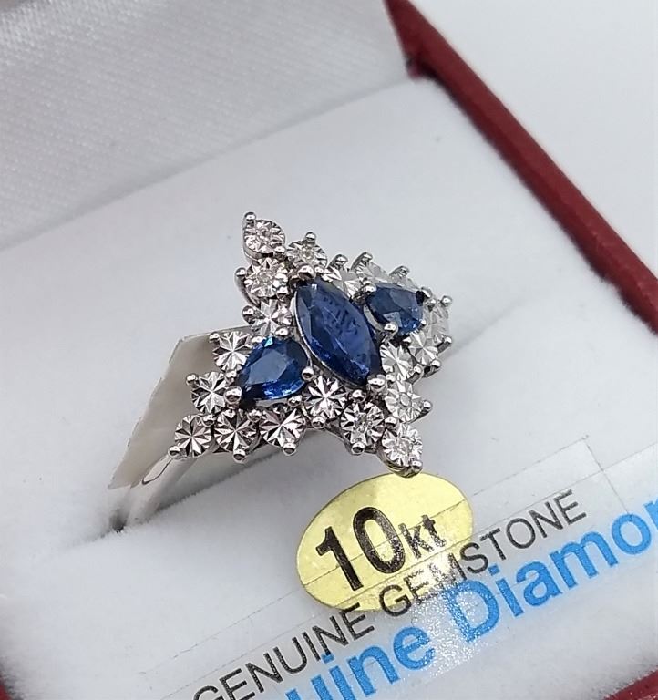 10KT WHITE GOLD GENUINE BLUE SAPPHIRE AND DIAMOND RING W/ APPRAISAL $1480 - SIZE 6.75, 0.6CT SAPPHIR