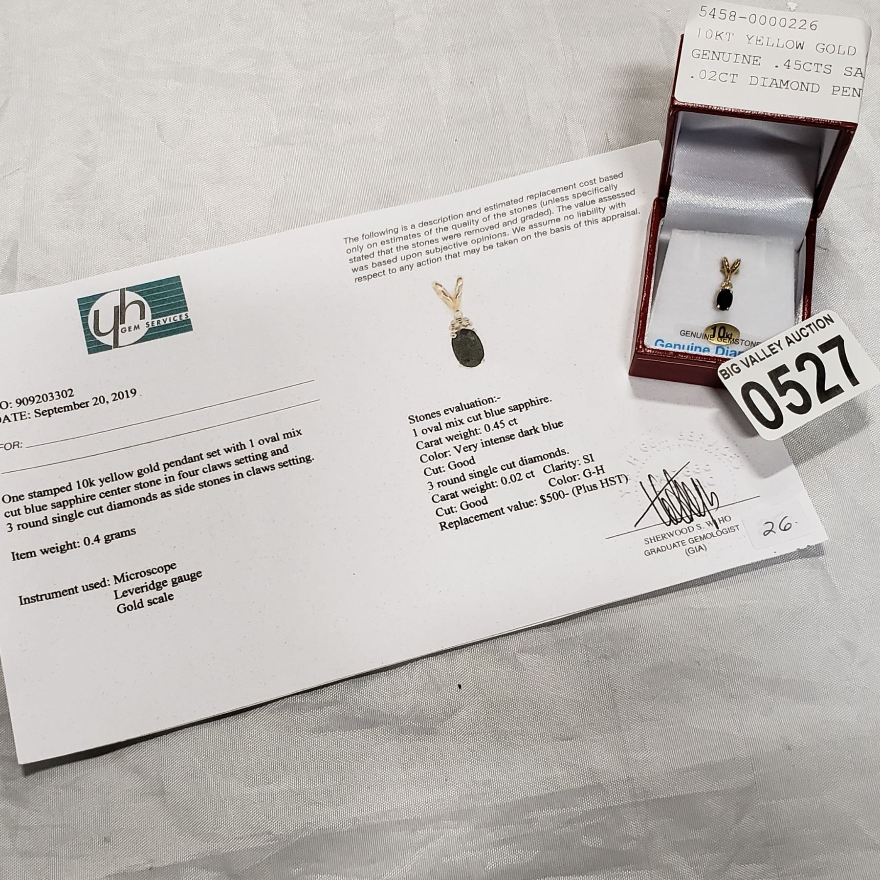 10KT YELLOW GOLD 4 x 6mm GENUINE .45CTS SAPPHIRE AND .02CT DIAMOND PENDANT W/ APPRAISAL $500