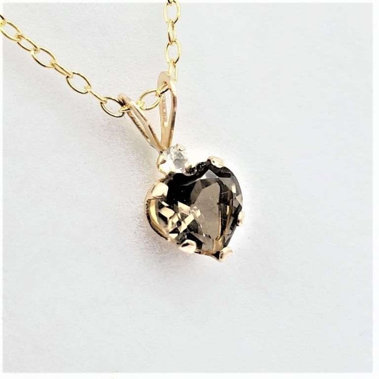 10KT. YELLOW GOLD 5.6MM X 6MM NATURAL SMOKY QUARTZ (0.45CTS) & MOONSTONE HEART PENDANT WITH STERLING SILVER CHAIN, W/A $690.00