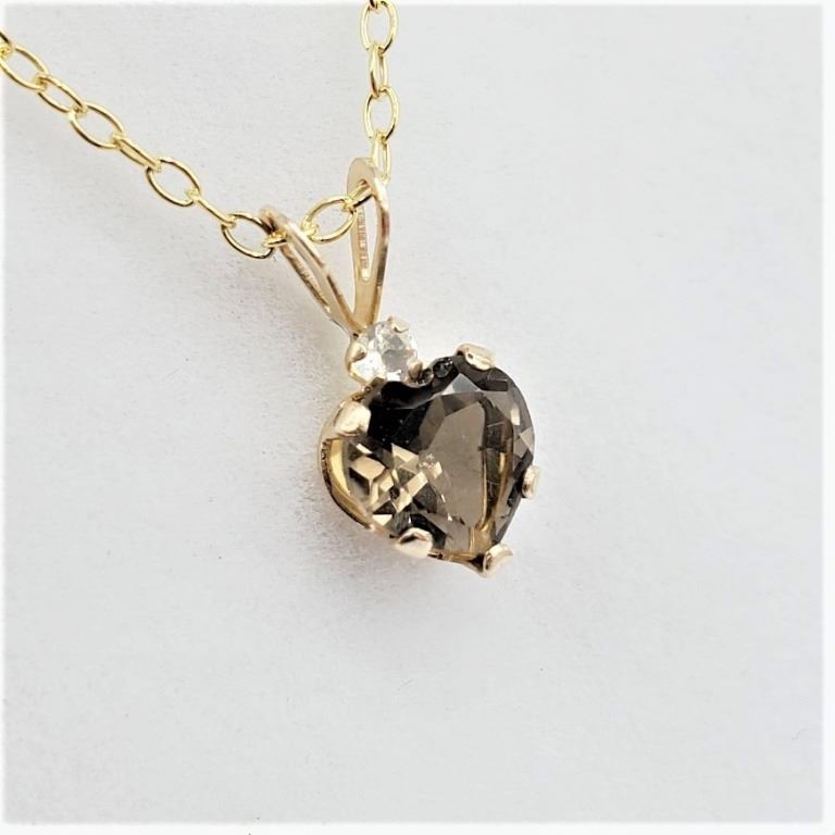 10KT. YELLOW GOLD 6MMX 6MM GENUINE SMOKEY QUARTZ HEART PENDANT WITH STERLING CHAIN, 0.67CTS OF QUARTZ, W/A $740.00