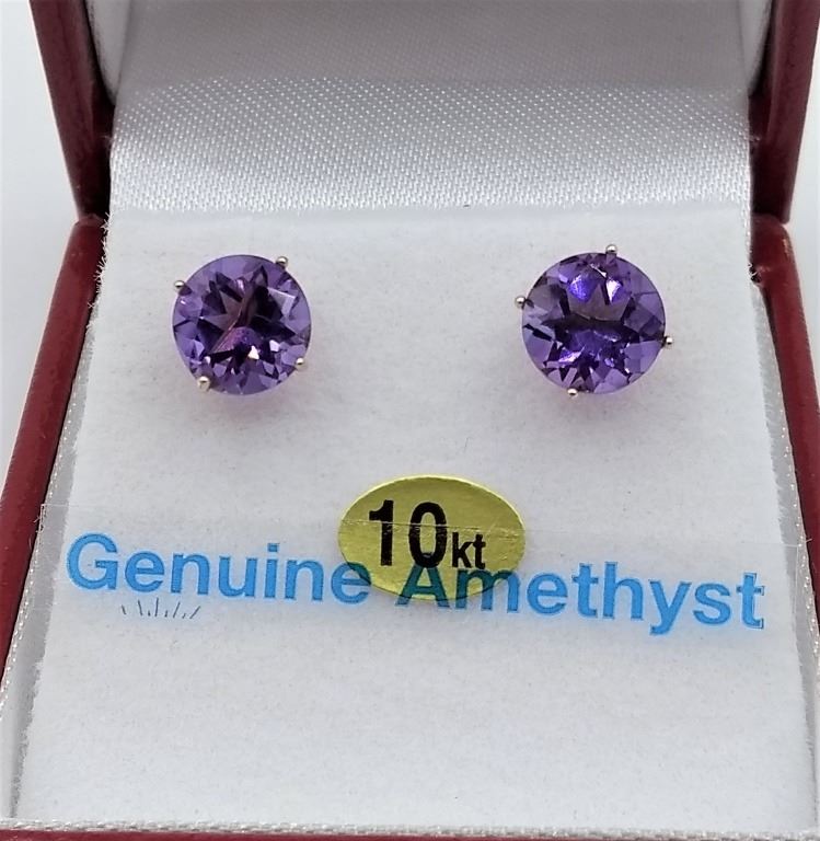 10KT YELLOW GOLD 7MM GENUINE AMETHYST STUD EARRINGS - RETAIL $500, 2.75CTS AMETHYST BIRTHSTONE FEBRU