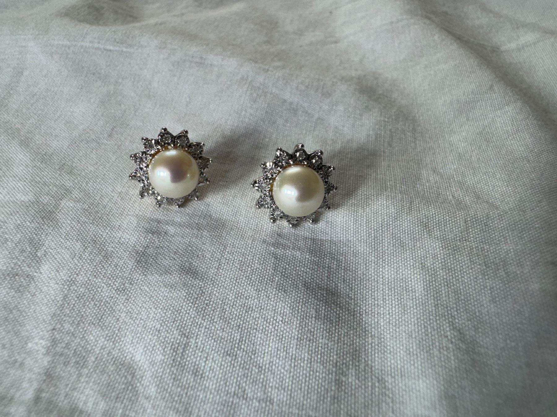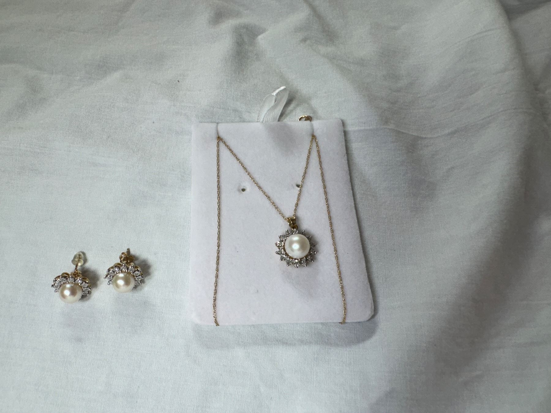 10KT YELLOW GOLD AND RHODIUM FINISH ROUND WHITE FRESH WATER PEARL AND DIAMOND PENDANT 13.90CM LONG WITH 14 SINGLE CUT DIAMONDS, WITH 10KT YELLOW GOLD ROPE STYLE CHAIN 46CM LONG, .60GRAMS PAIR OF 10KT YELLOW GOLD PEARL AND DIAMOND EARRING, WITH DIAMONDS TOTAL REPLACEMENT $1,175.00 APPRAISAL INCLUDED