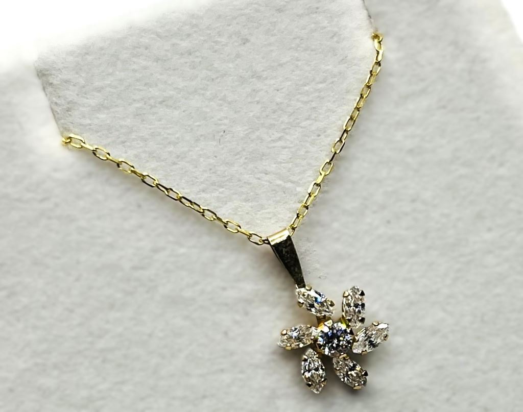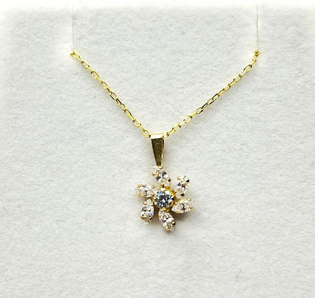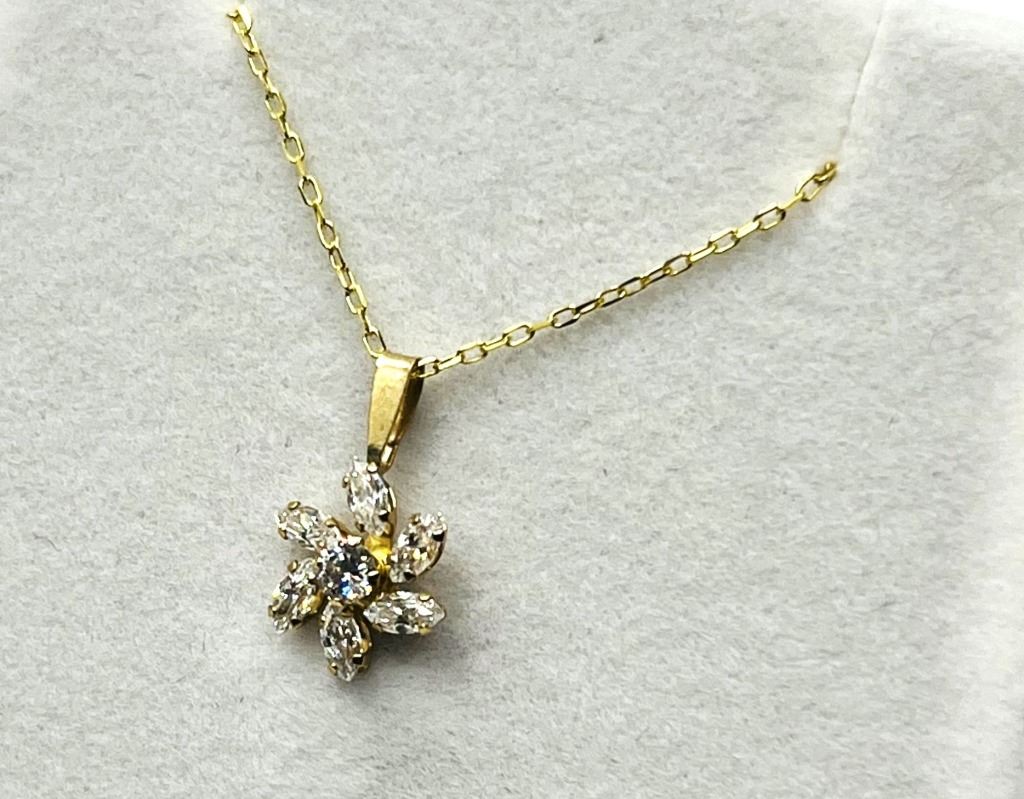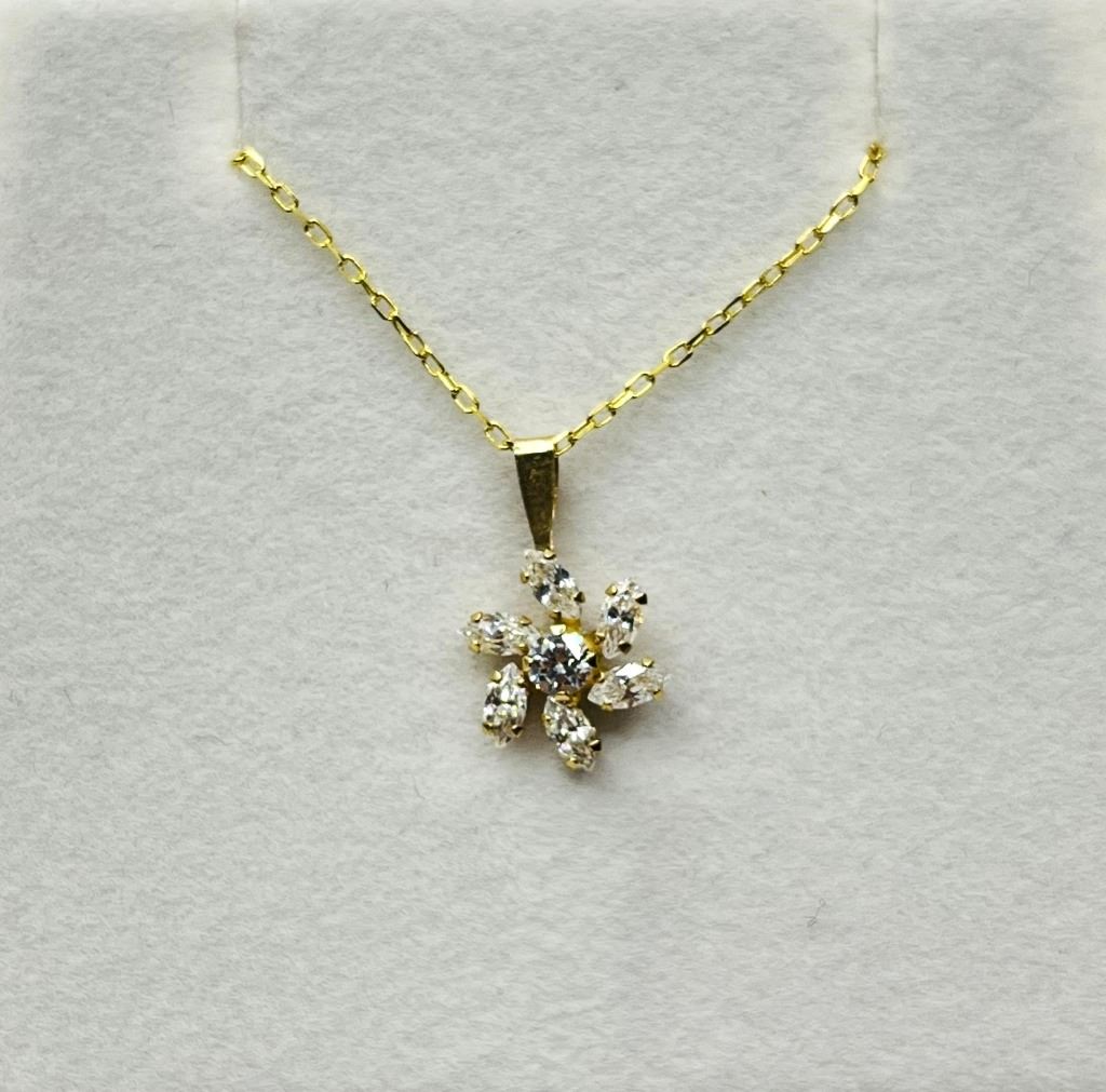 10KT YELLOW GOLD CZ FLOWER SHAPE PENDANT WITH GOLD PLATED STERLING SILVER CHAIN, RETAIL $350.00.