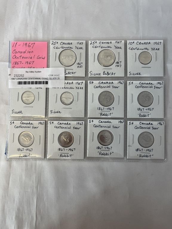 11 - 1967 CANADIAN CENTENNIAL COINS SILVER 25 CENT AND 10 CENT PLUS RABBIT NICKELS