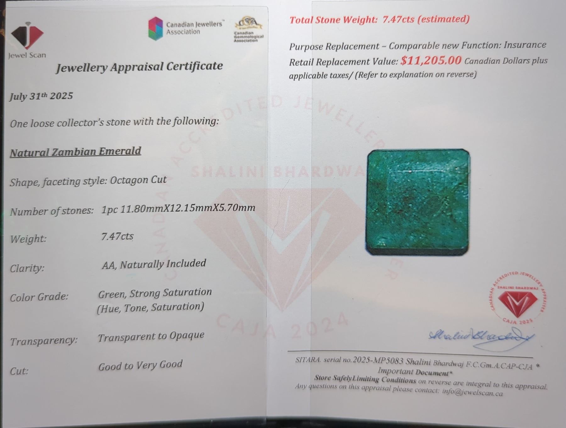 $11,205 Appraisal - 7.47 ct Cert. Emerald Gemstone