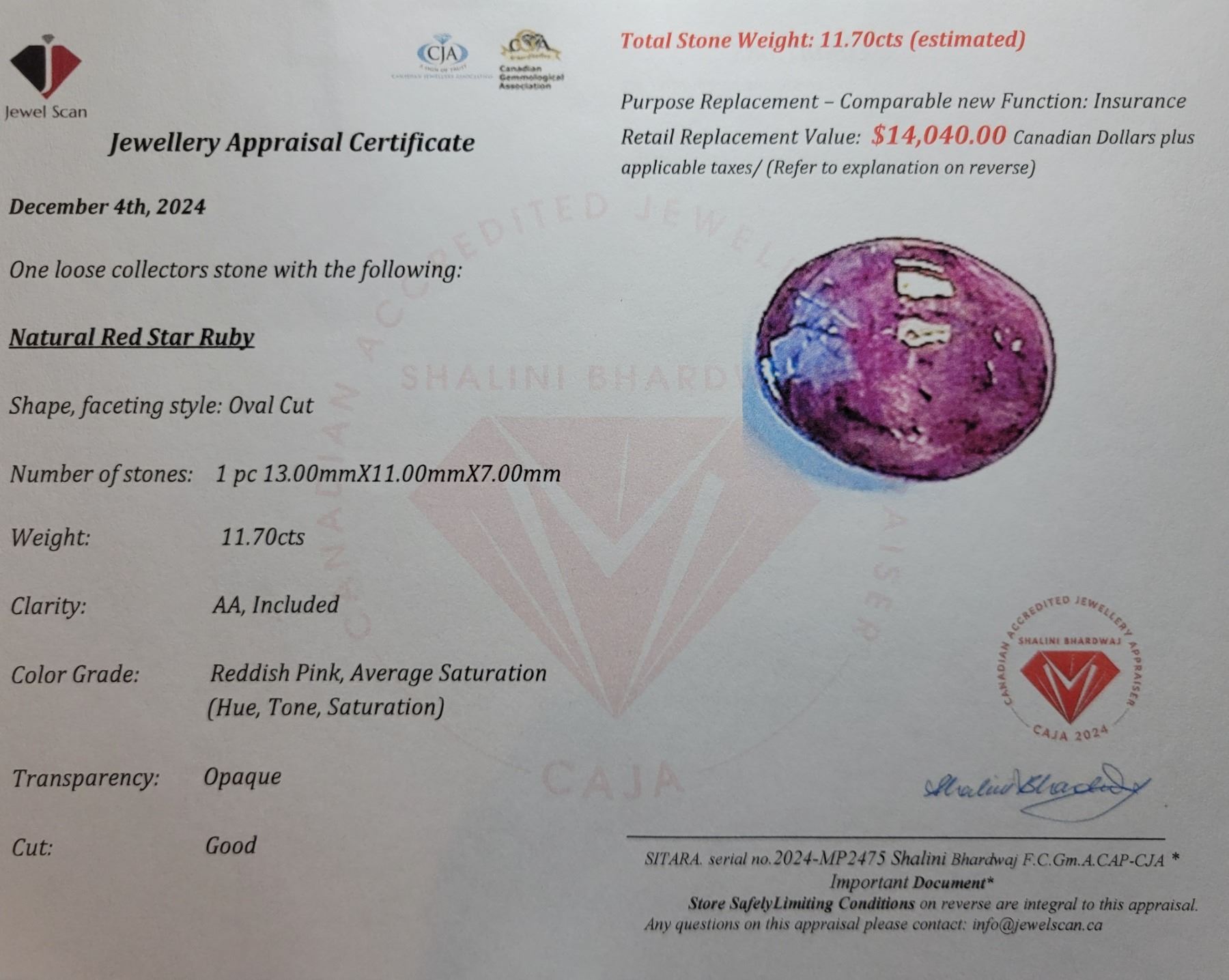 11.70 CT CERTIFIED STAR RUBY GEMSTONE ($14,040 APPRAISAL)