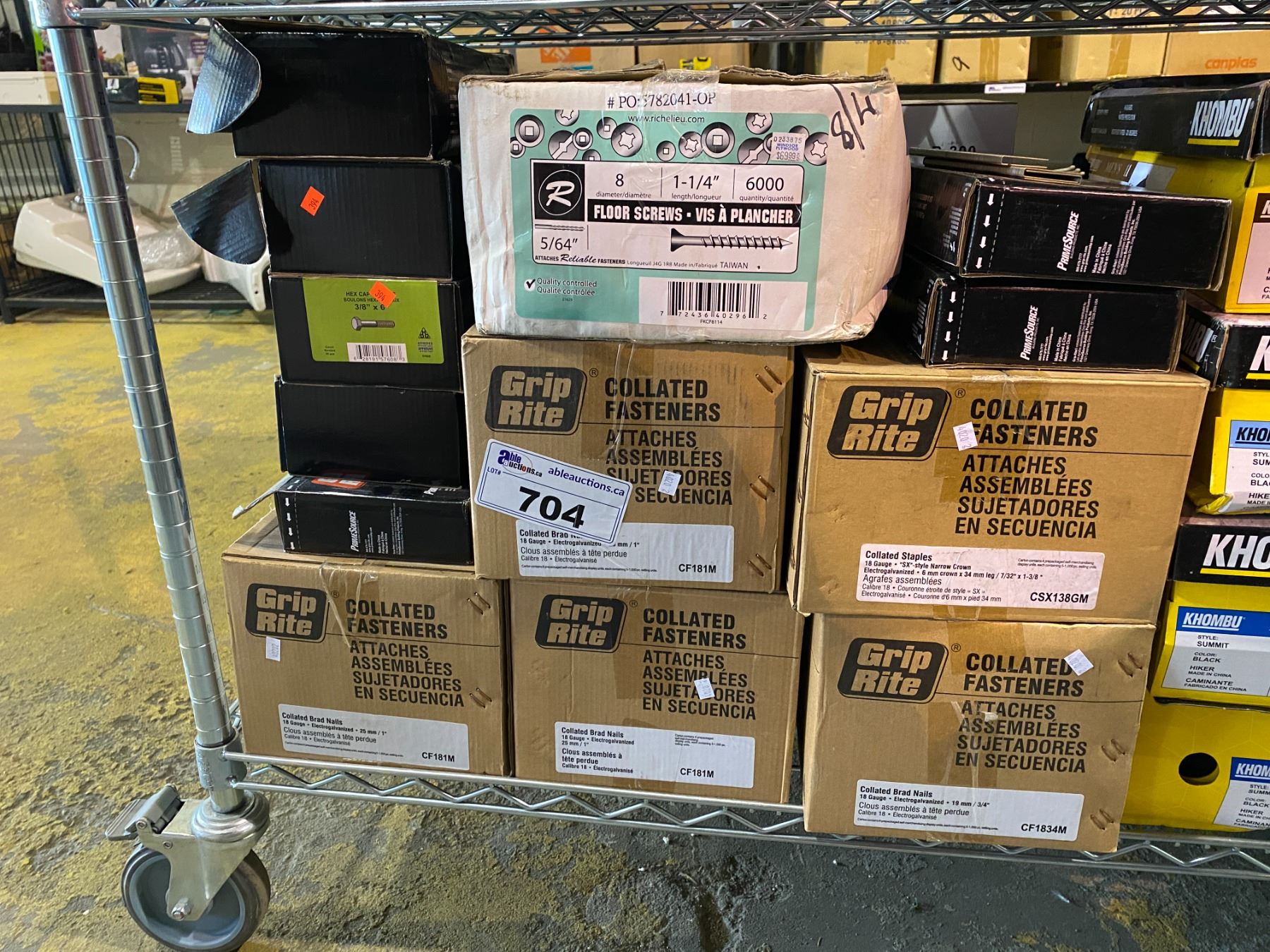 11 BOXES OF GRIP RITE 18 GAUGE STAPLES, BOX OF 1-1/4" SCREWS & ASSORTED BOLTS & ANCHORS