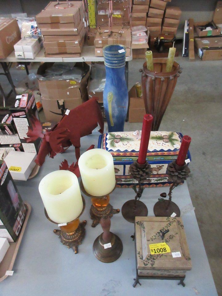 Brass bell, pillar candles, metal moose statues, 18" tall glass vase and more.