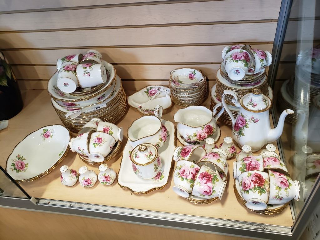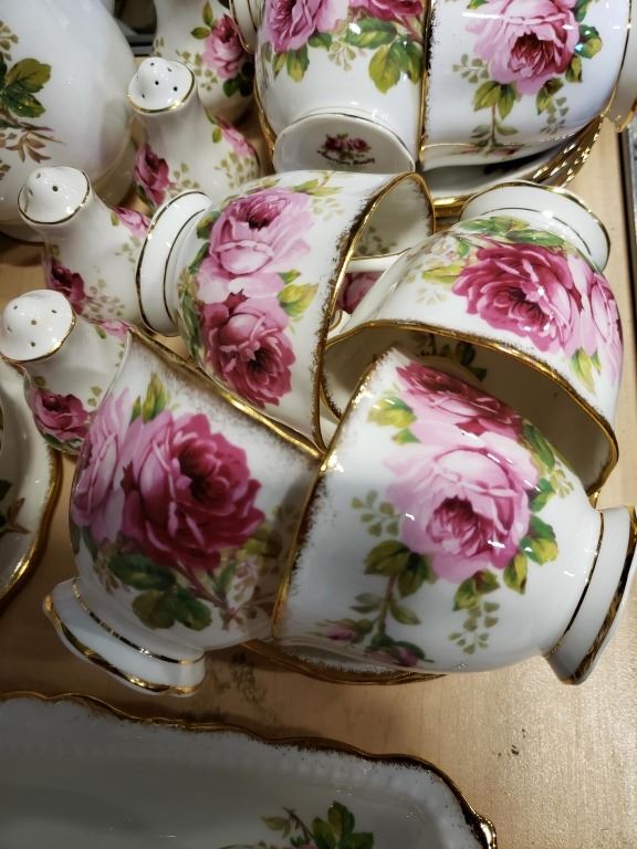 110 PIECES ROYAL ALBERT AMERICAN BEAUTY CHINA - INCLUDES TEAPOT, 15 CUPS AND SAUCERS, SEEVING PIECE