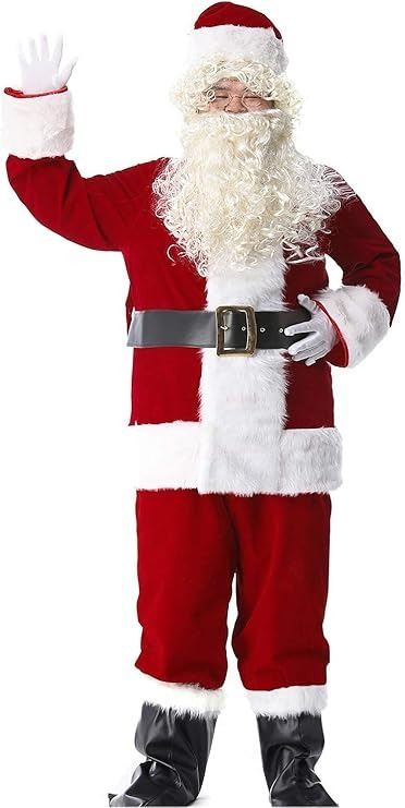 - Obosoyo Men's Deluxe Santa Suit 11pc. Christmas Adult Santa Claus Costume (Includes hat, jacket, belt, gloves, pants, boot tops, glasses, wig, beard, gift bag)