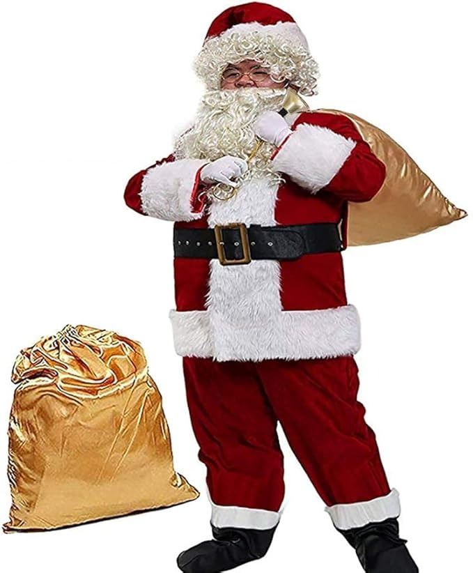 - Obosoyo Men's Deluxe Santa Suit 11pc. Christmas Adult Santa Claus Costume (Includes hat, jacket, belt, gloves, pants, boot tops, glasses, wig, beard, gift bag)