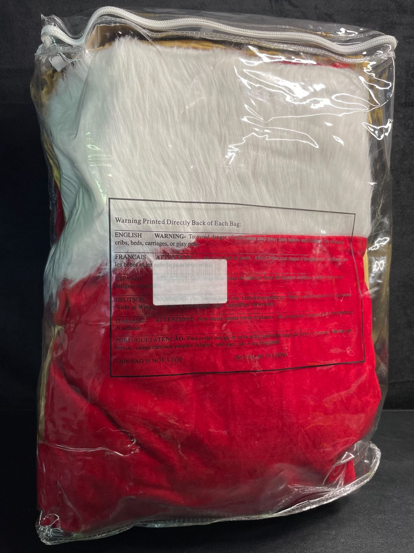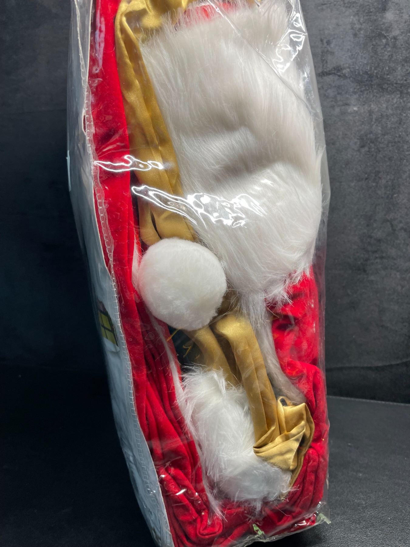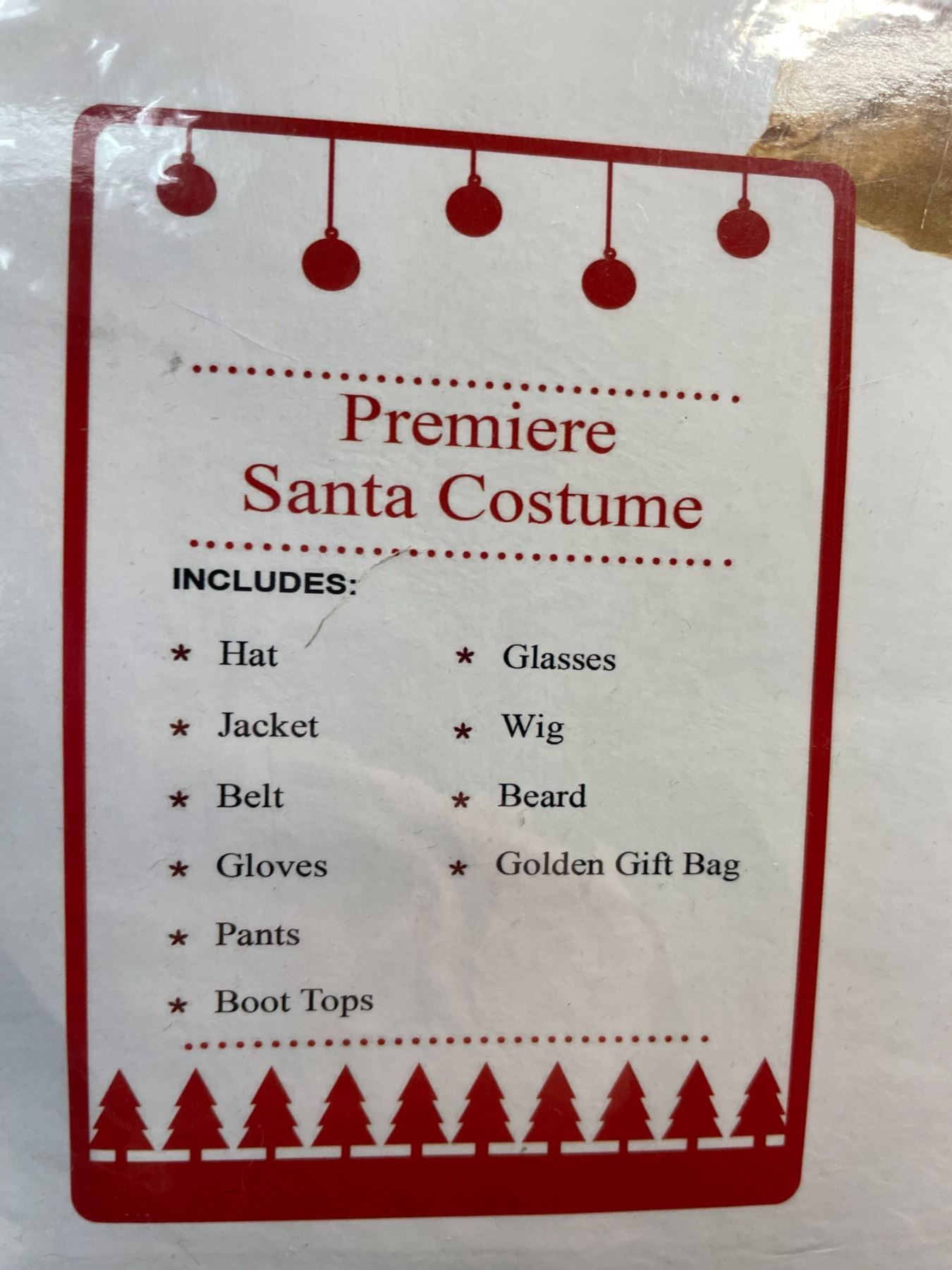 - Complete Christmas Santa Claus 11pcs Set - Red Plush Santa Zipper Coat, Red Pants with Elastic Waist, Christmas Hat, Buckle Belt, Black Boot Tops(We suggest you to wear a pair of black leather shoes), White Gloves, Glasses, Wig, Beard, Gold Bell, Gold gift bag. With this wonderful classic santa suit.
