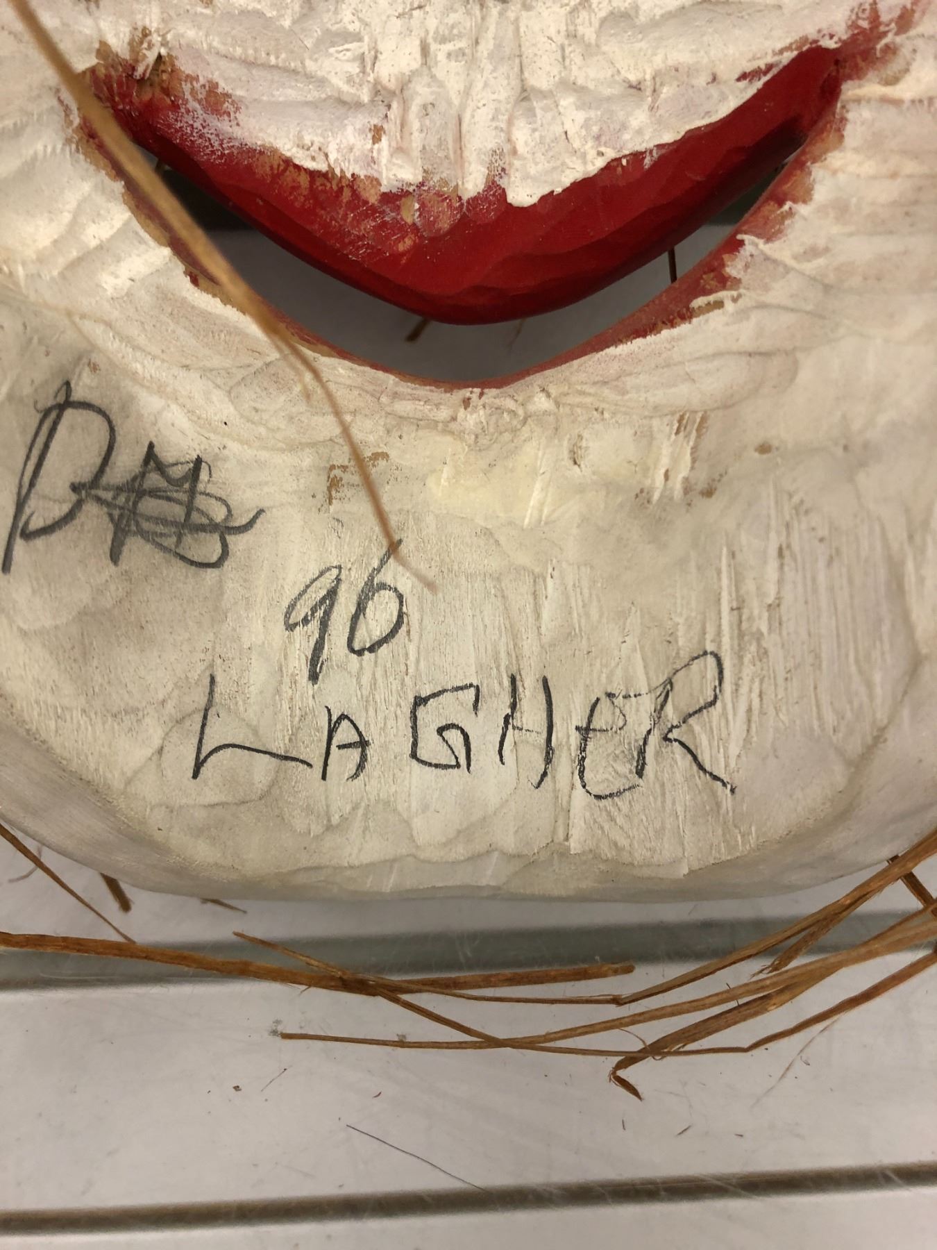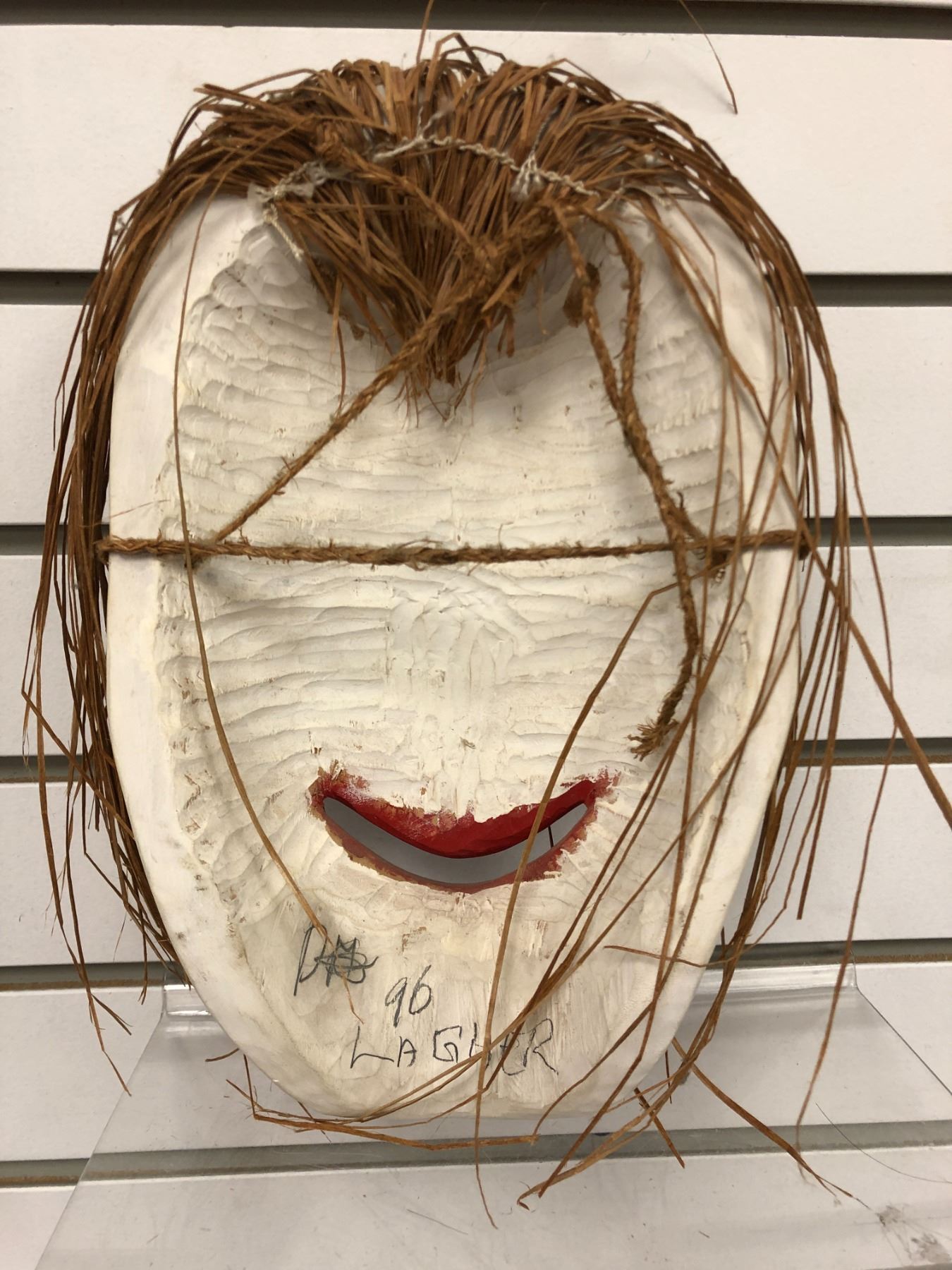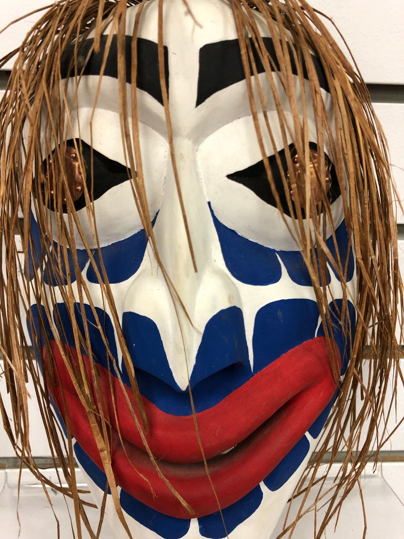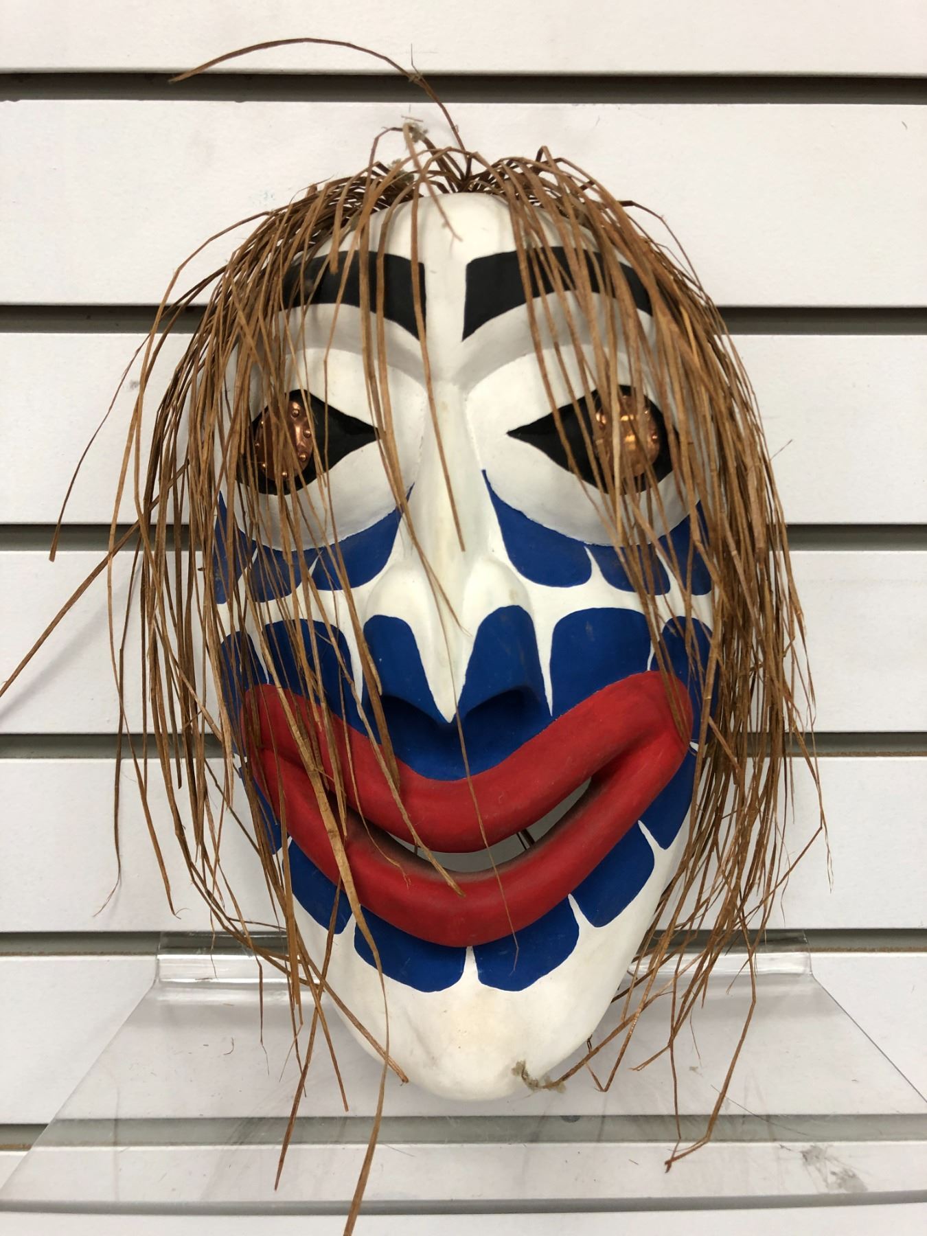11in West Coast First Nations carved wooden face mask w/ cedar bark hair & copper eyes signed Lagher 1996