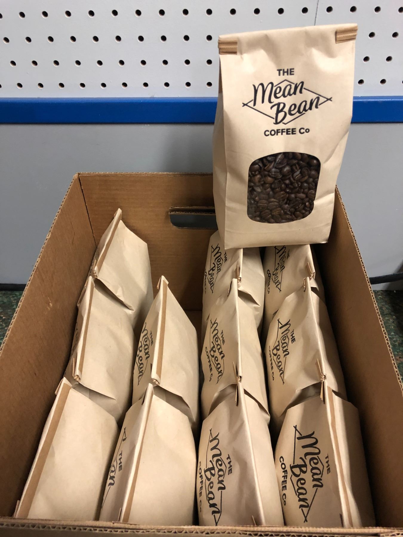 12 1lb bags of "The Mean Bean" Coffee Co coffee beans from the Blockbuster partial animated movie