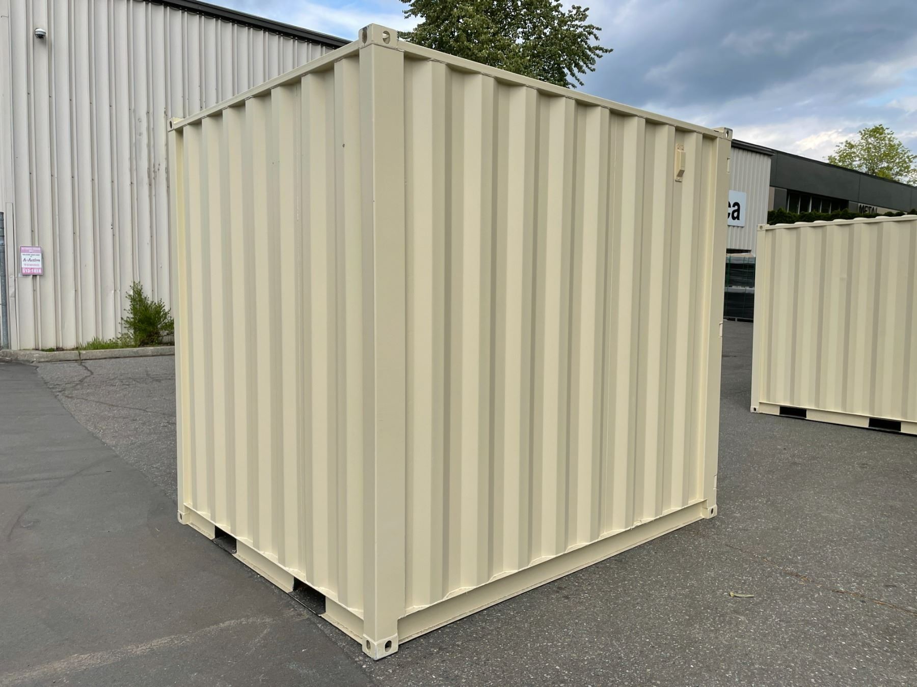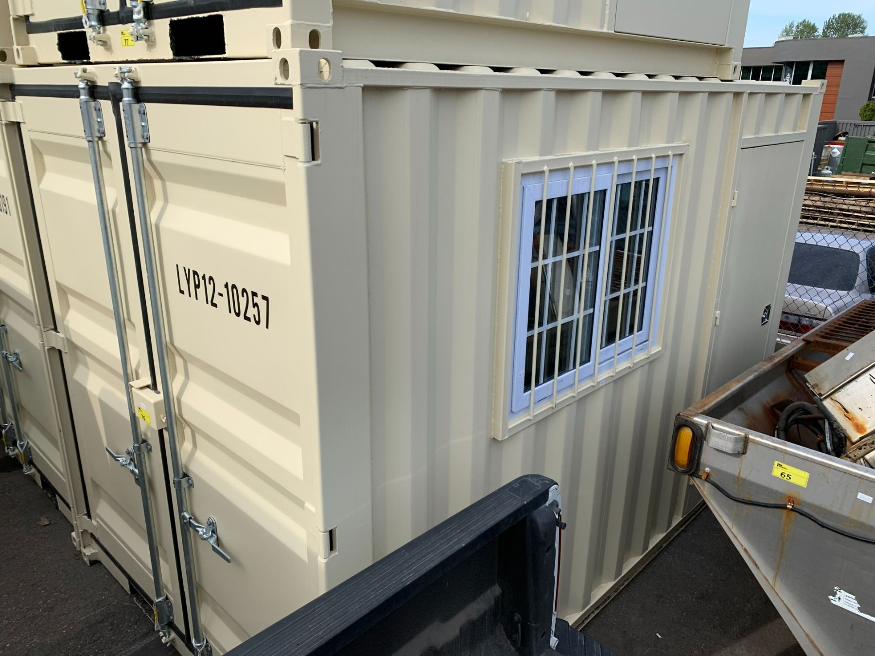 12' BEIGE PORTABLE OFFICE CONTAINER W88" X L144" X H99" WITH WINDOW, LOCKING MAN DOOR, WOOD FLOOR, & DUAL SWING CAM LOCK REAR DOORS