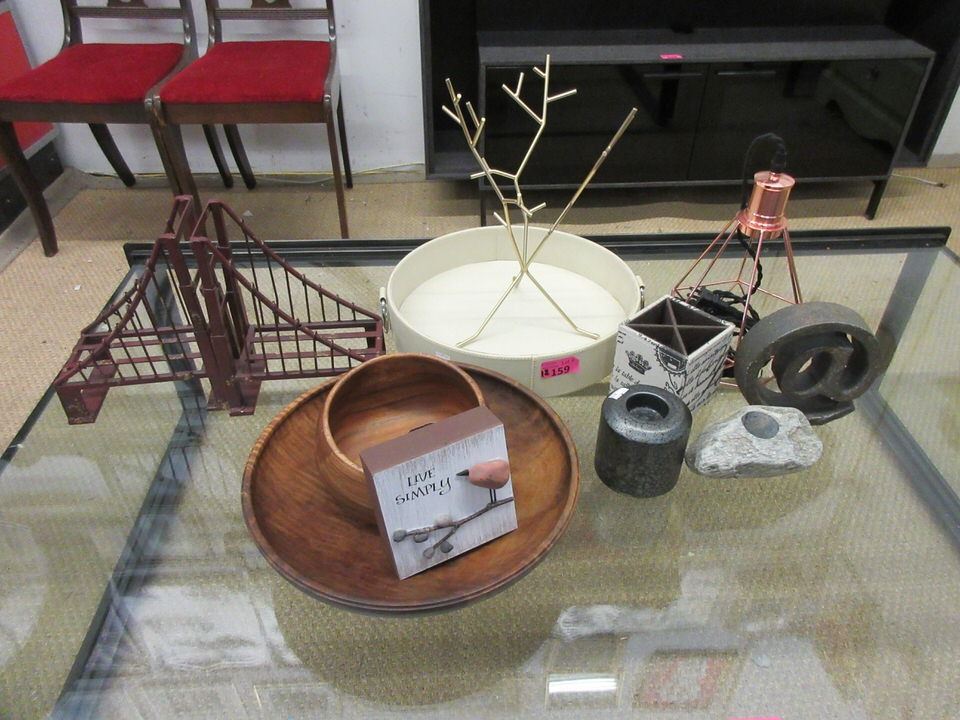 Bridge bookends, copper hanging light, candle holders, wood bowls and more.