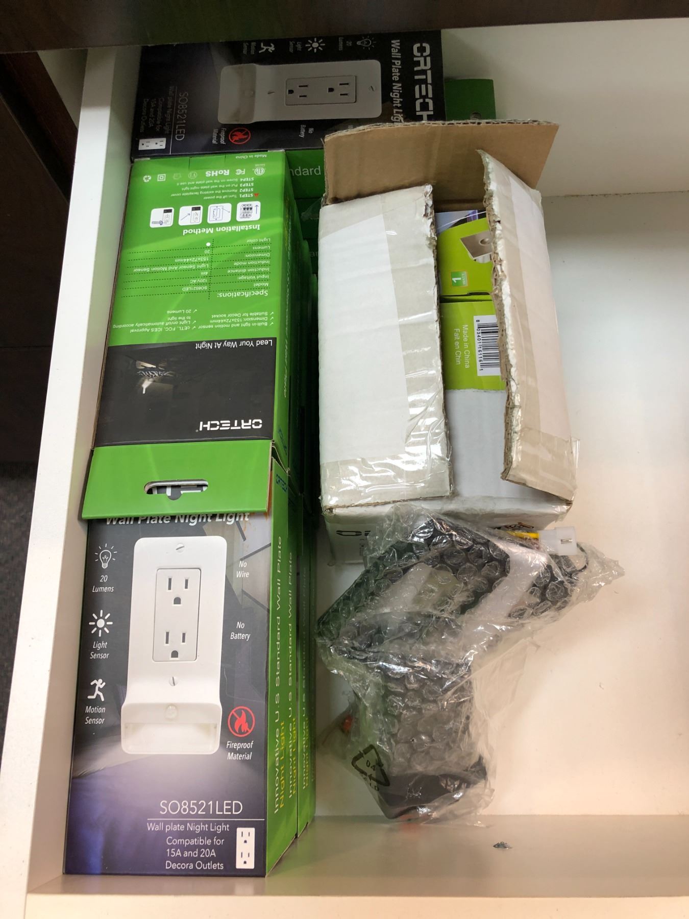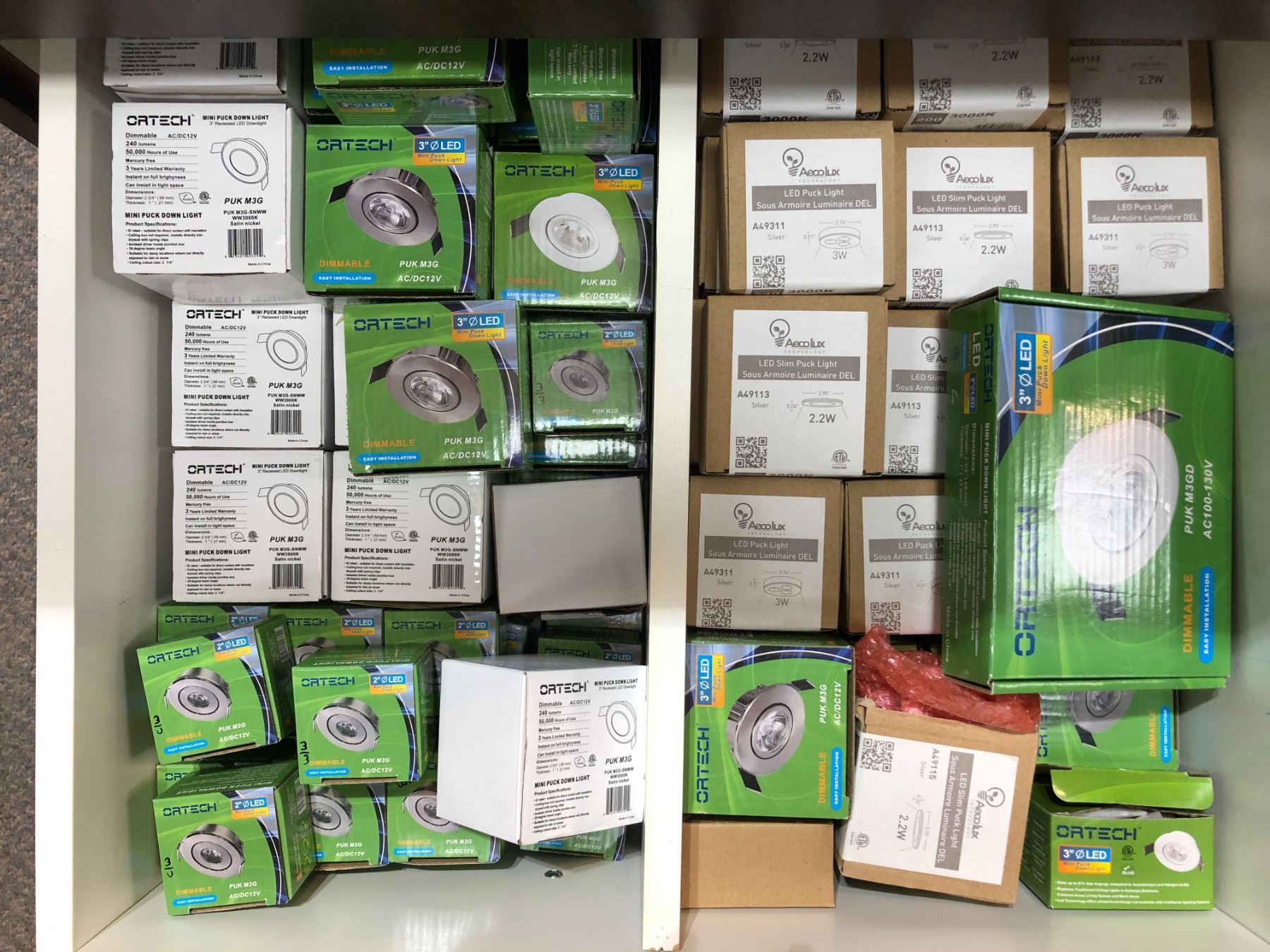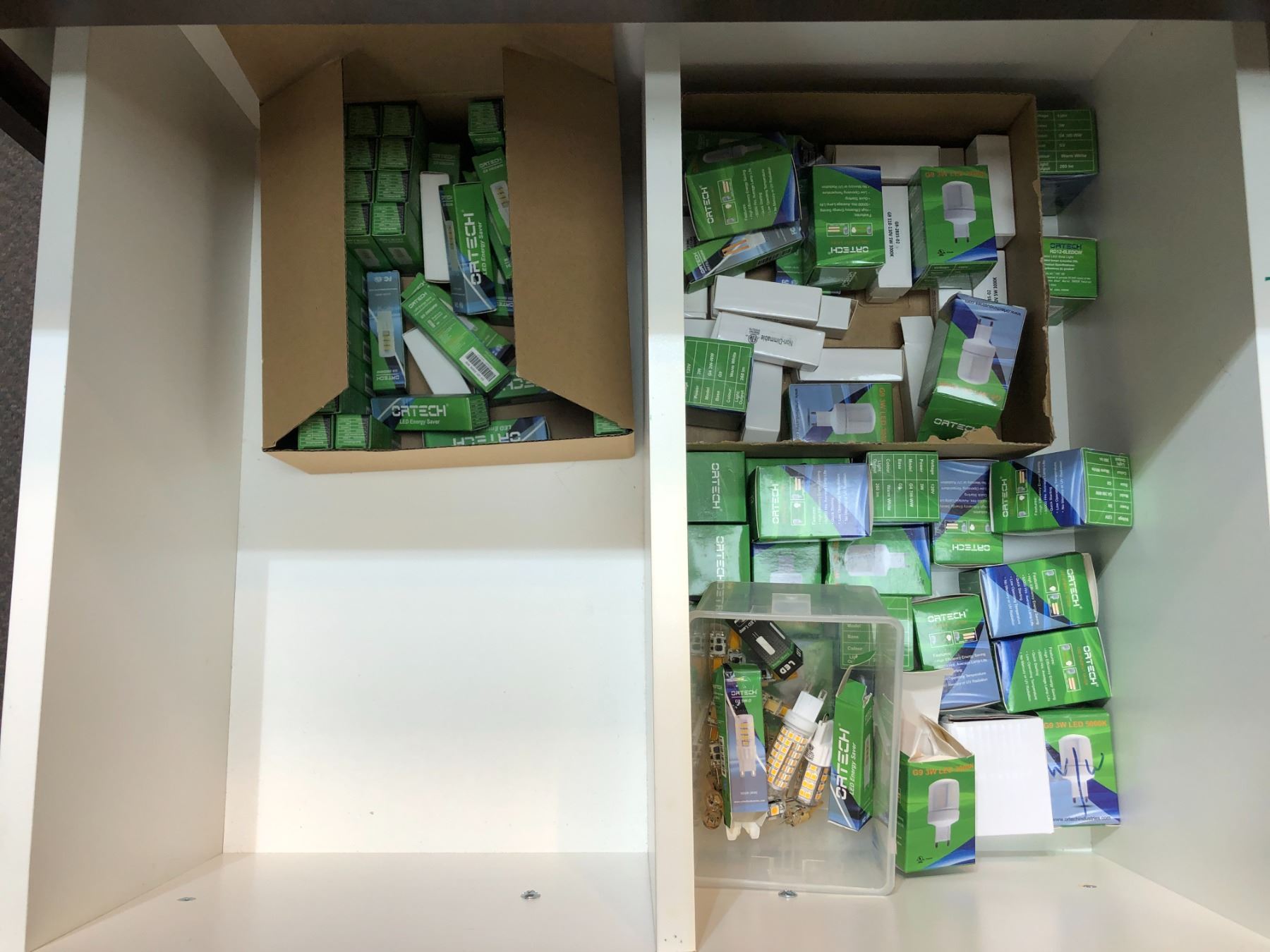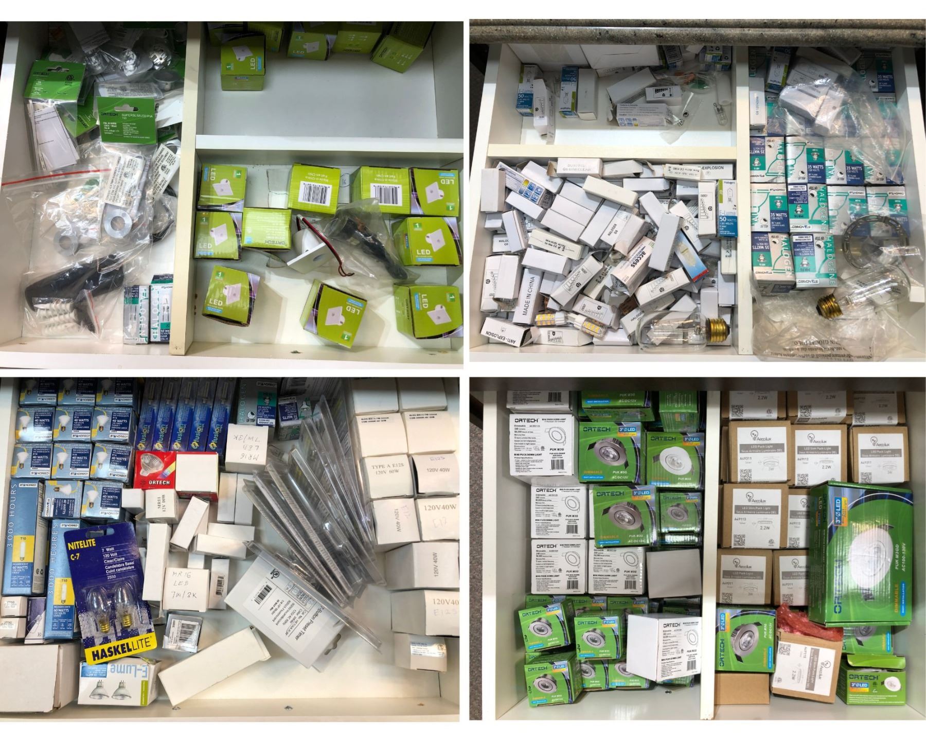 12 Drawers full of assorted items - bulbs, LED energy savers, 2in mini puck lights, LED step light, wall plate nightlights, ceiling lights, LED strip lights (approx. 150 pcs)