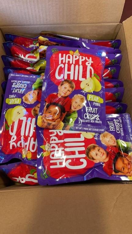 12 NEW CASES OF HAPPY CHILD FRUIT CRISPS - 4 CASES OF EACH FLAVOR APPLE, PEAR, STRAWBERRY BANANA, 24 PACKS PER CASE