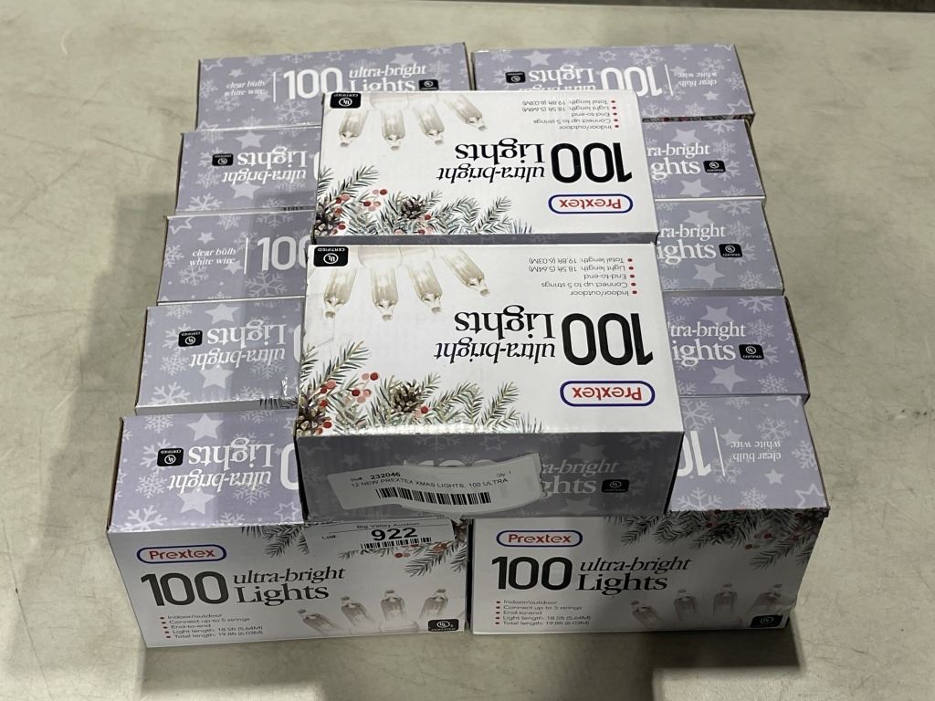 12 NEW PREXTEX XMAS LIGHTS, 100 ULTRA BRIGHT LIGHTS PER PACKAGE