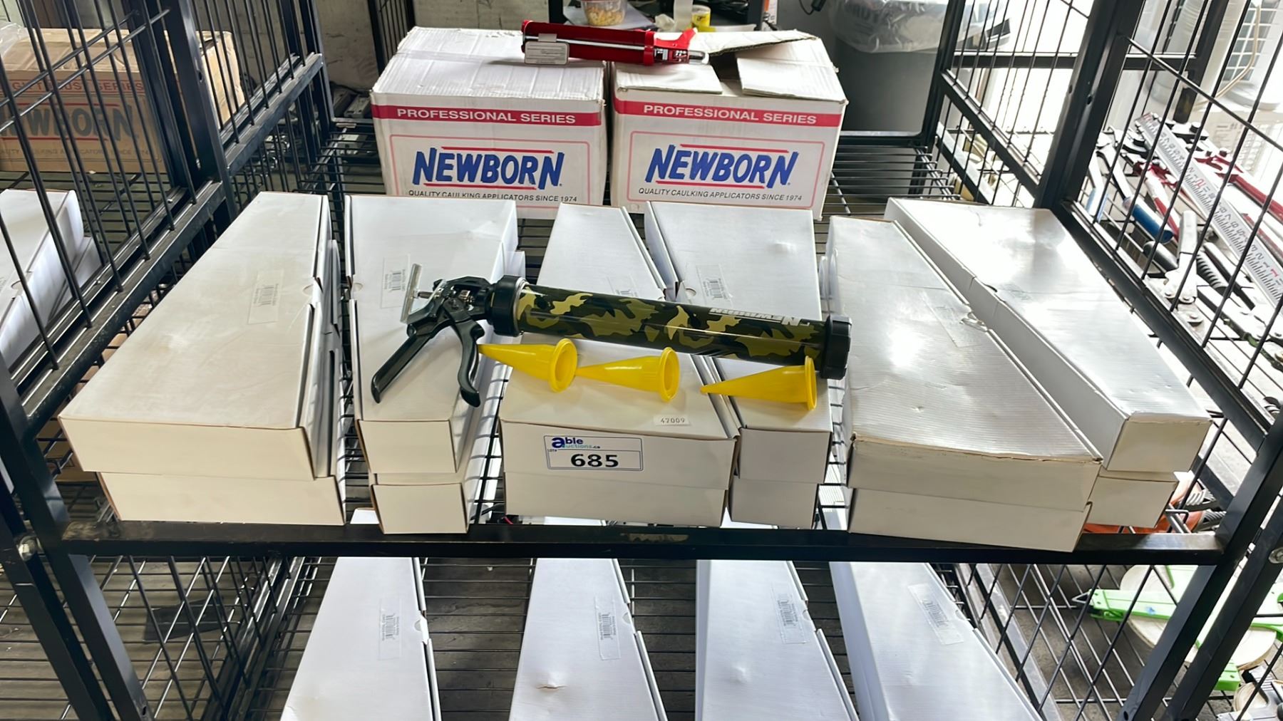 12 NEWBORN 620AL-CAMO CAULKING GUNS - EACH INCLUDES 3 YELLOW CONE NOZZLES