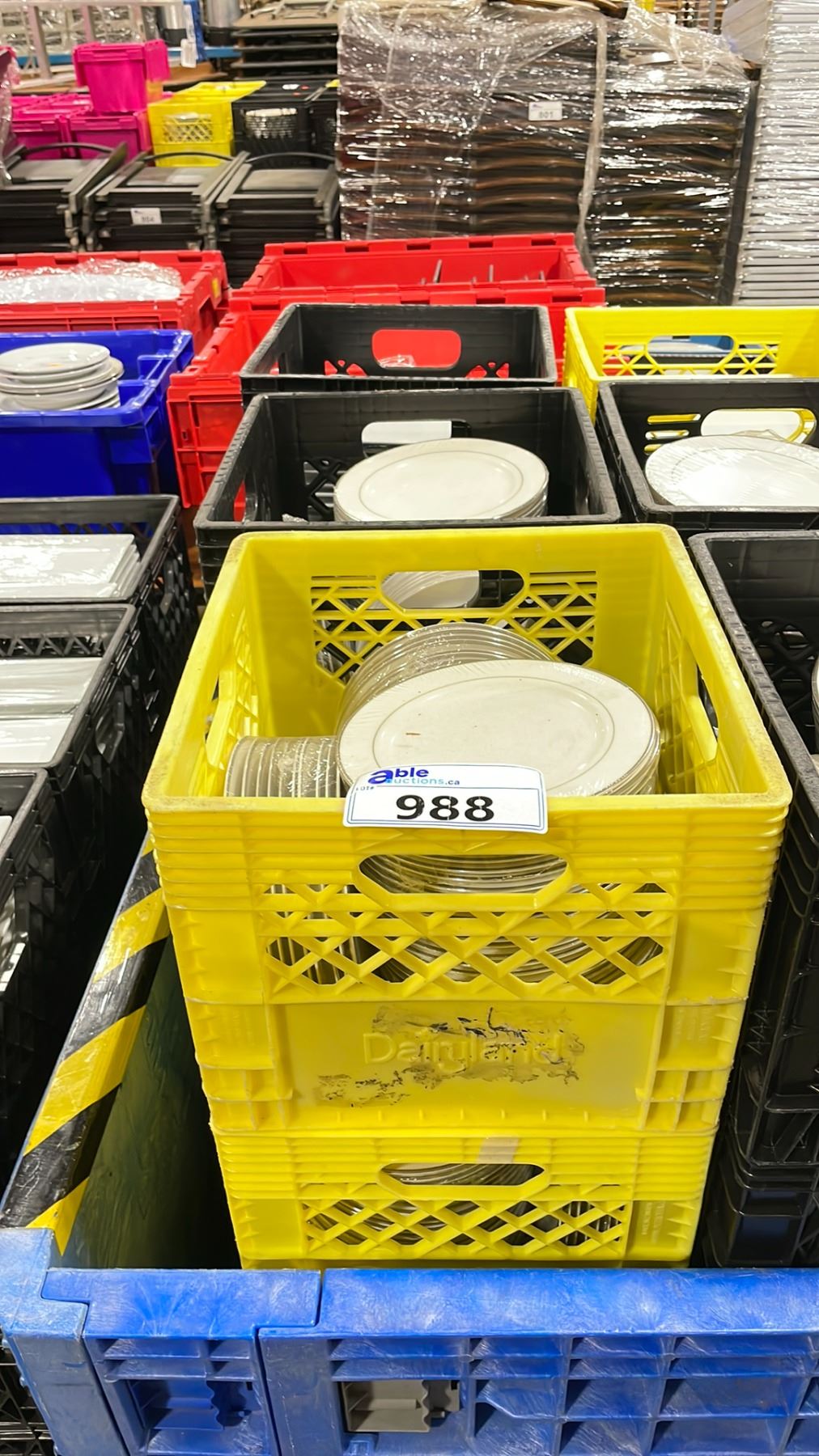 12 PLASTIC CRATES OF ASSORTED WHITE SQUARE COMMERCIAL RESTAURANT DINNER PLATES & SILVER RIMMED 8" SIDE PLATES *PLASTIC CRATES INCLUDED* ( APPROX. 50 PLATES PER CRATE )