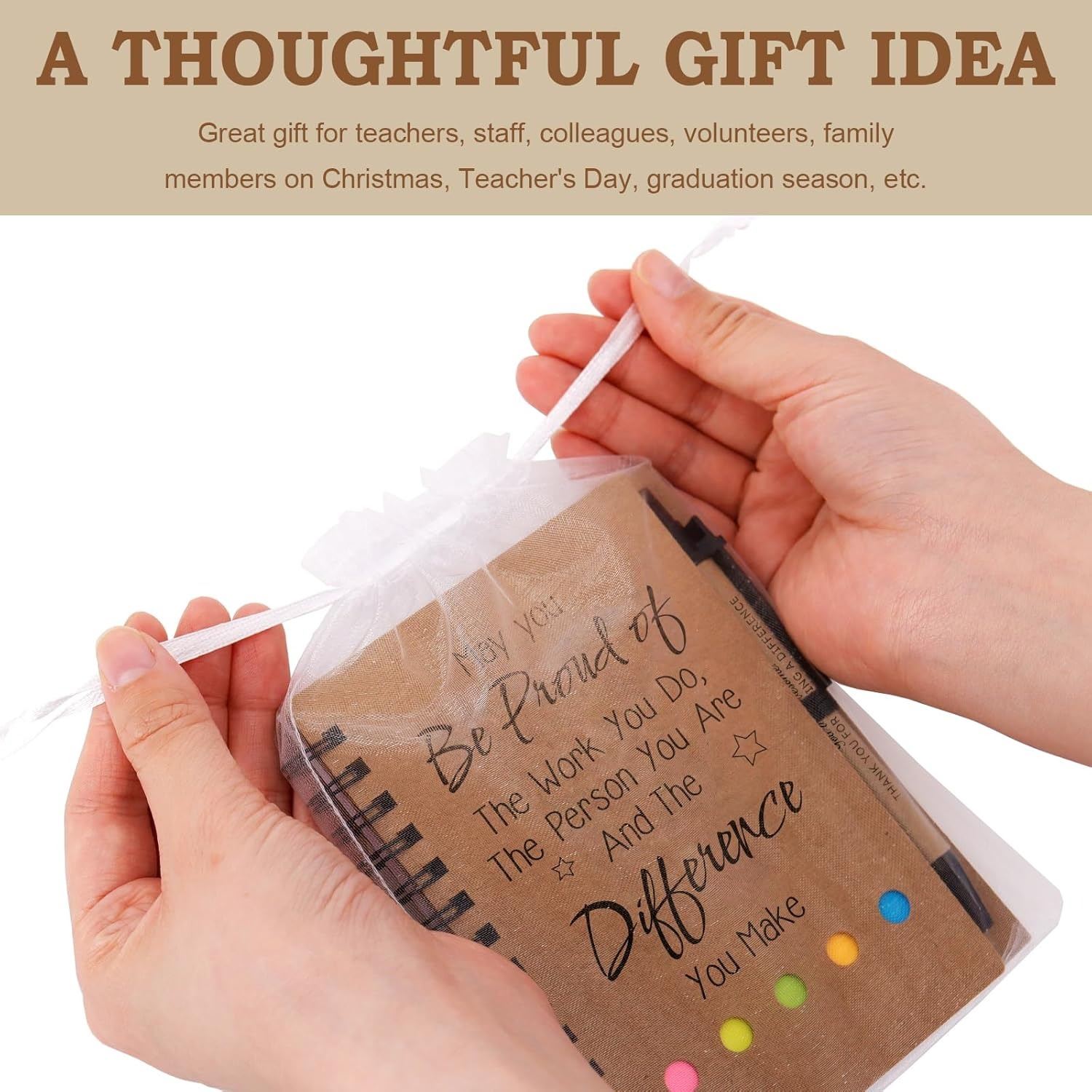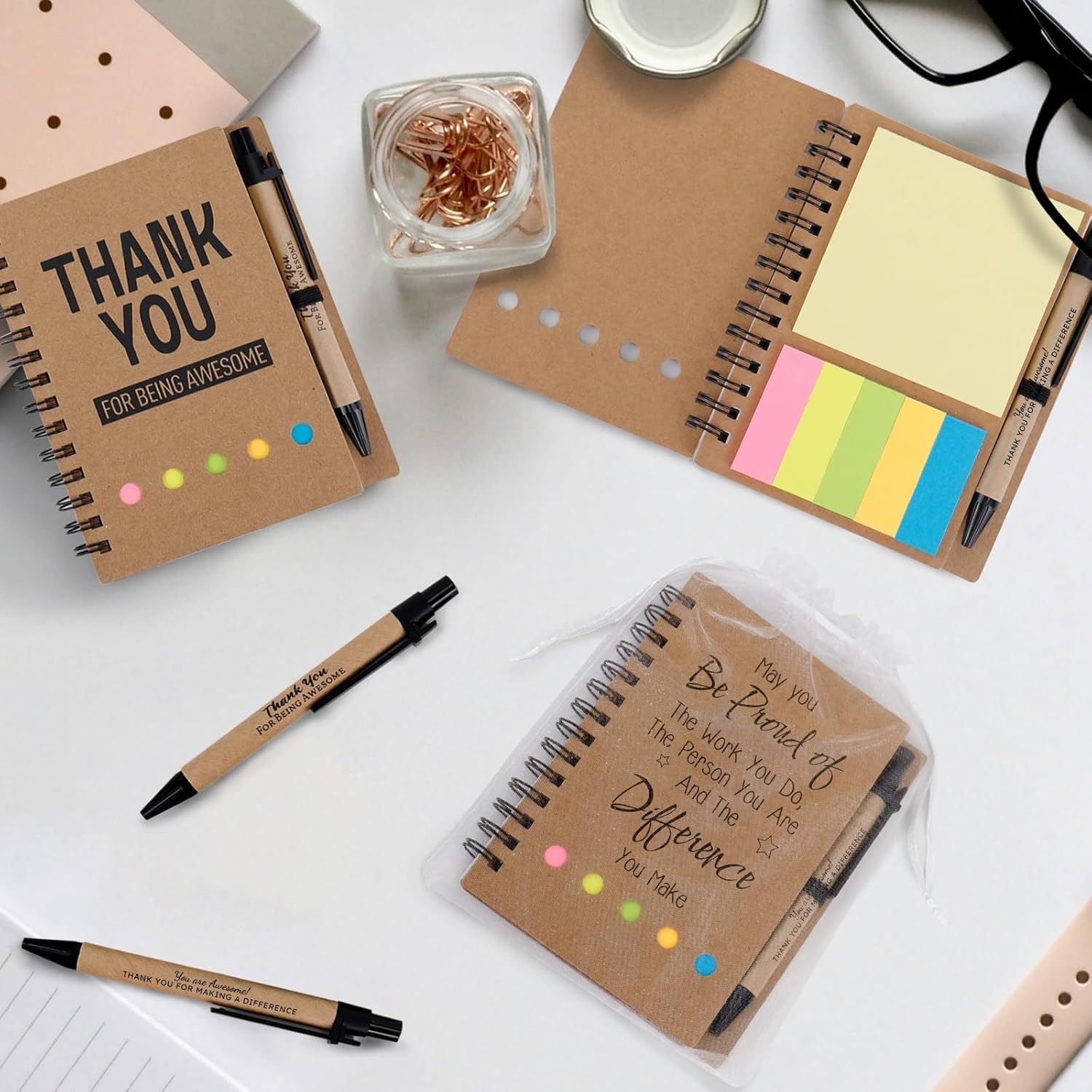 - Thank you gifts with notebooks and retractable ballpoint pens will make your gifts practical and thoughtful, and a white organza gift bag makes it easier for you to wrap your gifts more elegantly.