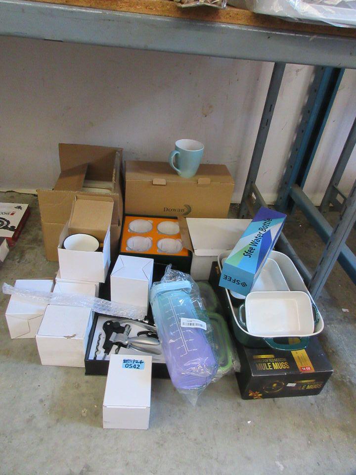 Case of coffee mugs, beverage glasses, wine opening kit, bakeware, water bottles, and more.