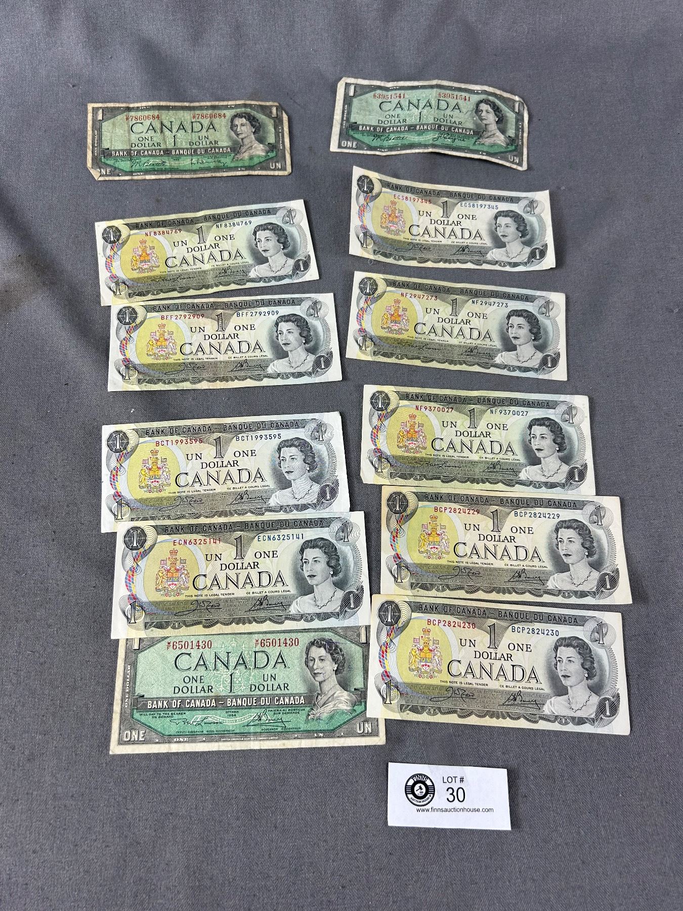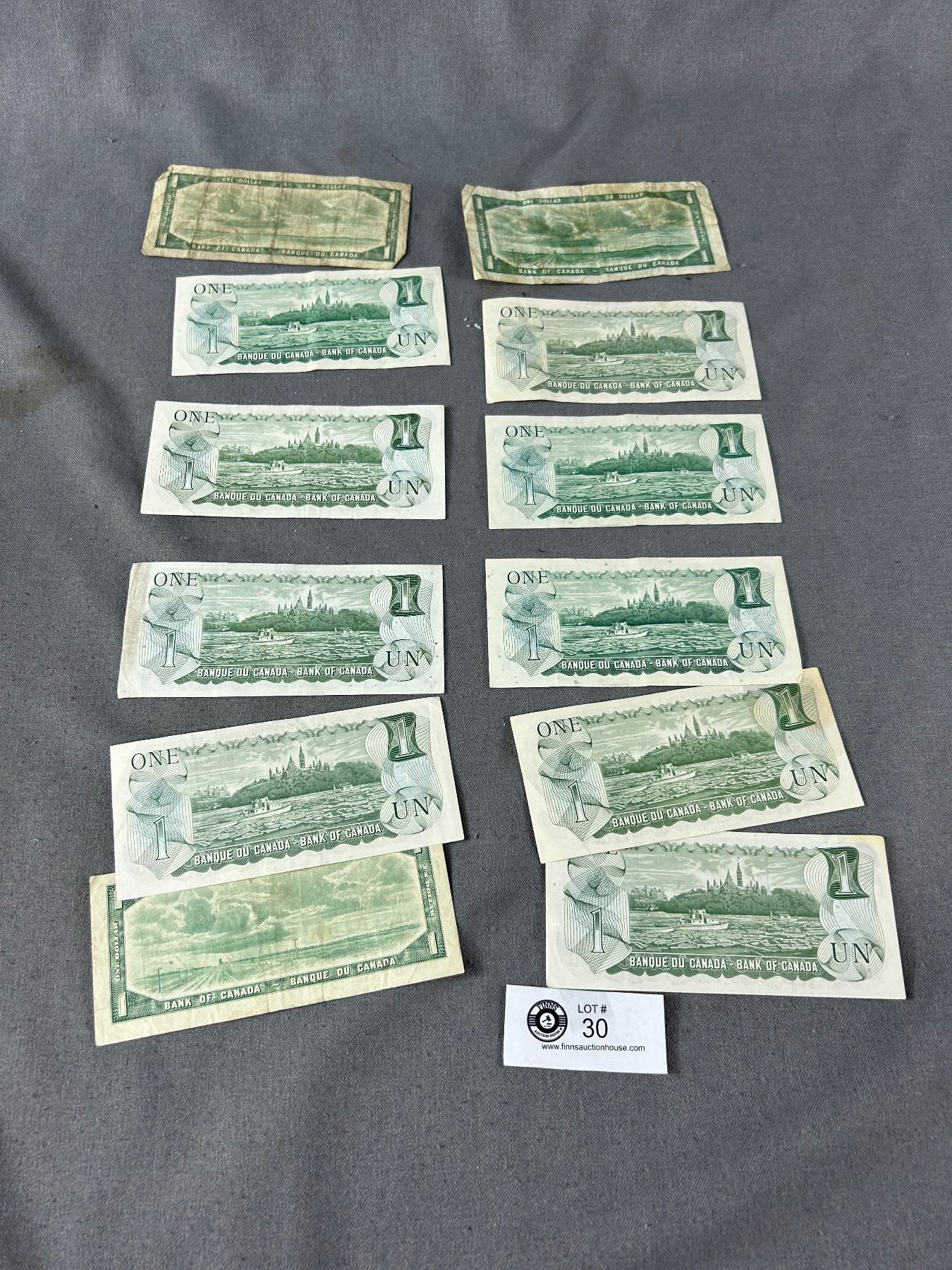 12 Vintage Canadian $1 Paper Bills Includes 3 From 1954