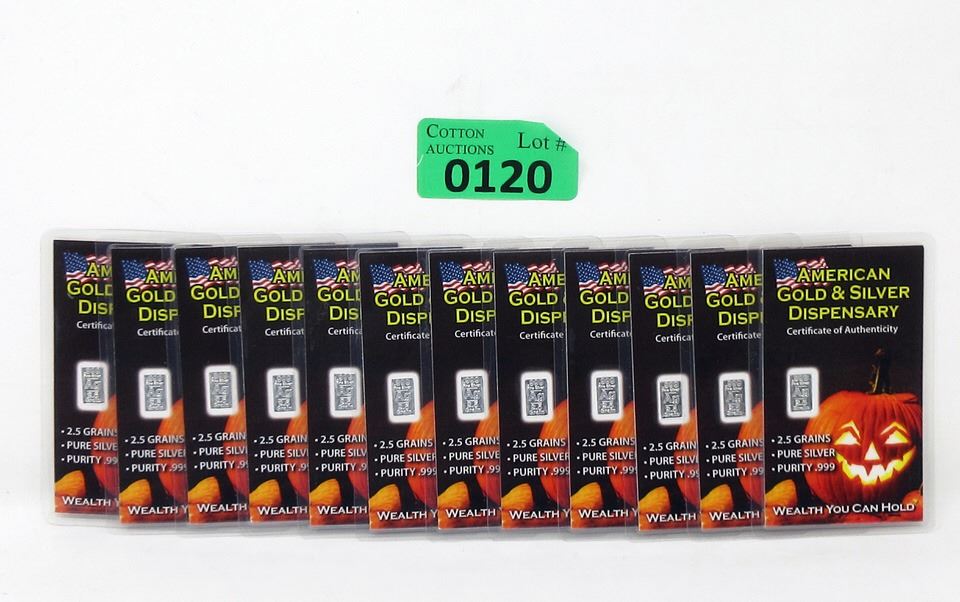 Each bar is 2.5 Grains. Total of 30 Grains. Minted in the USA. All individually sealed on certificate of authenticity cards. Tax exempt