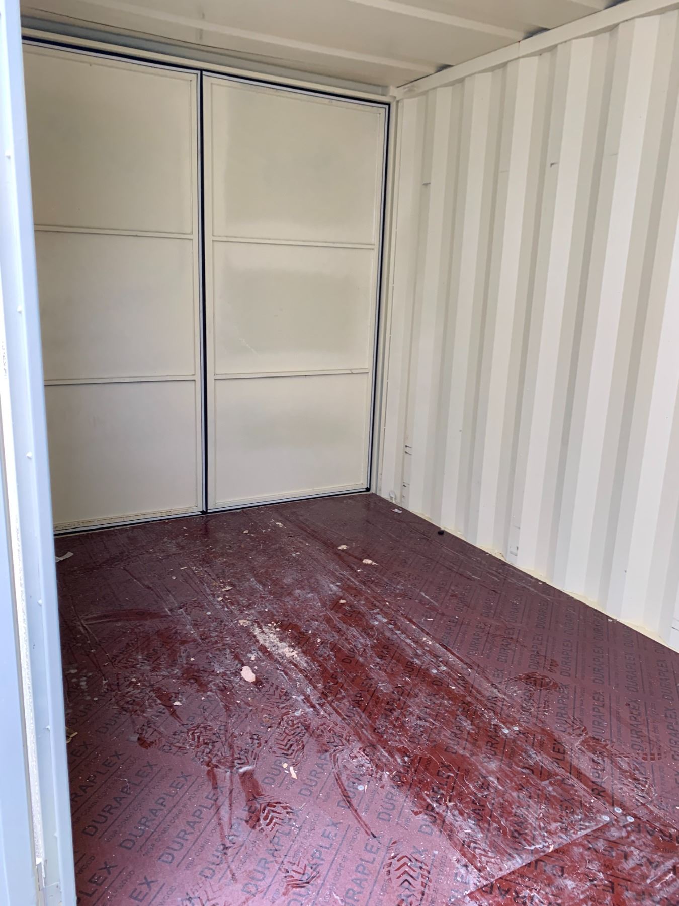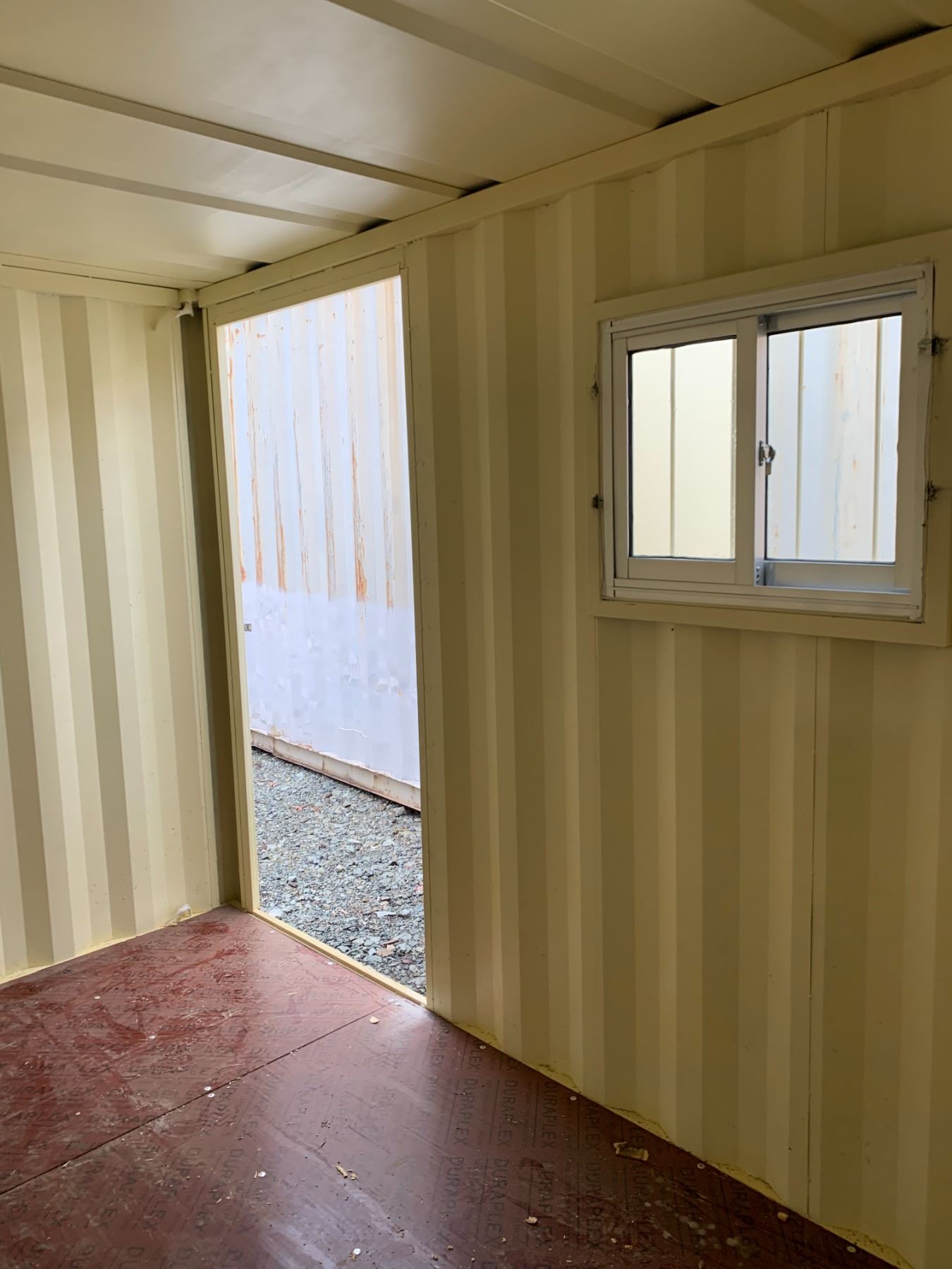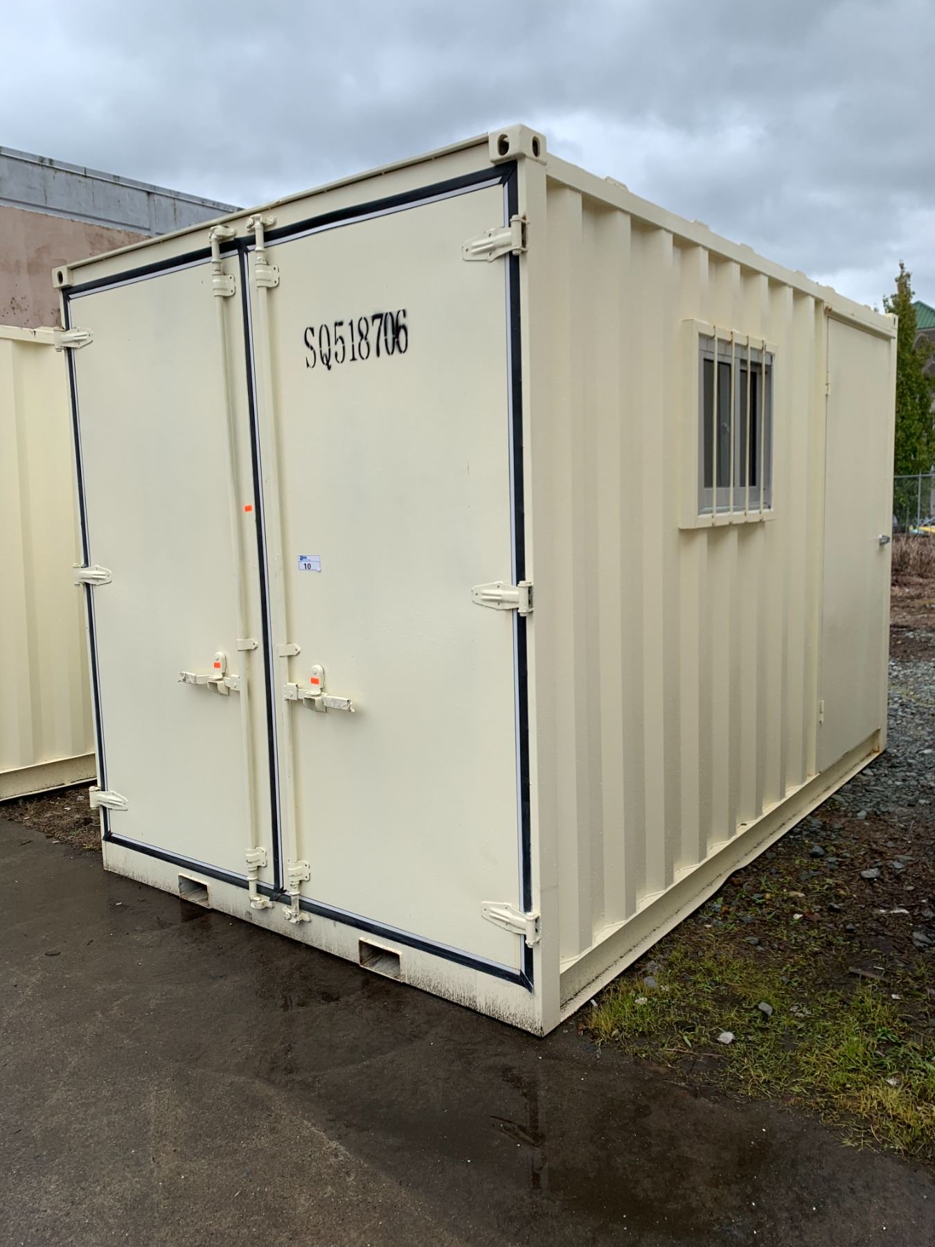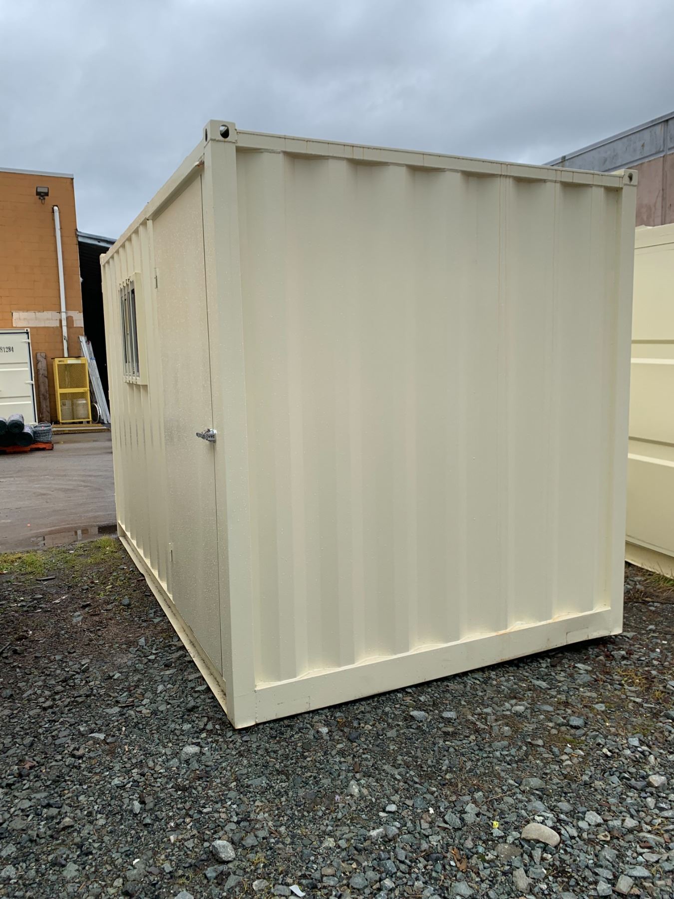 12FT CREAM OFFICE STORAGE SHIPPING CONTAINER WITH DUAL SWING REAR DOORS WITH CAMS, SIDE MAN DOOR & WINDOW 142"X86'X94"