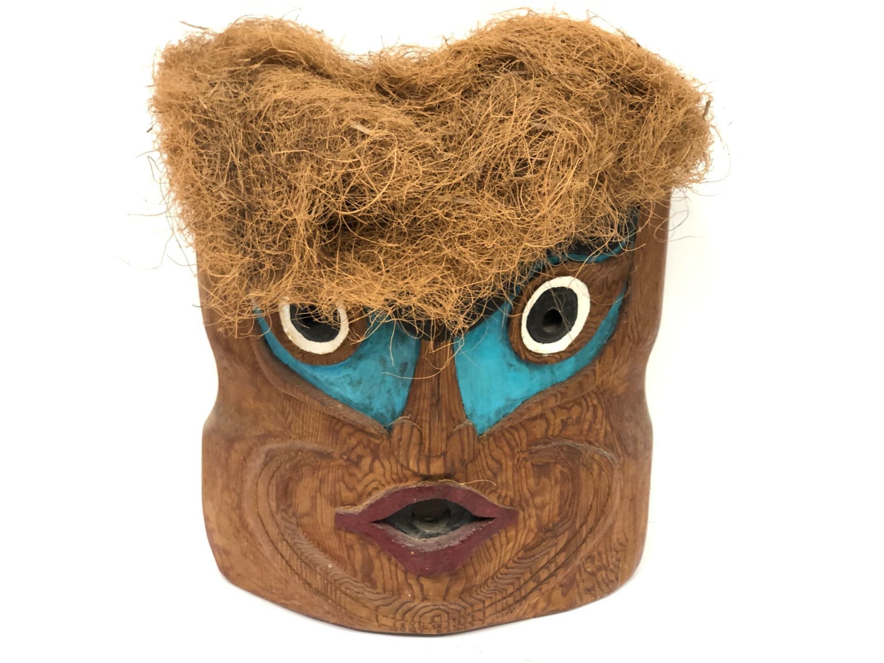 12in West Coast First Nations carved cedar face mask w/ cedar strand hair