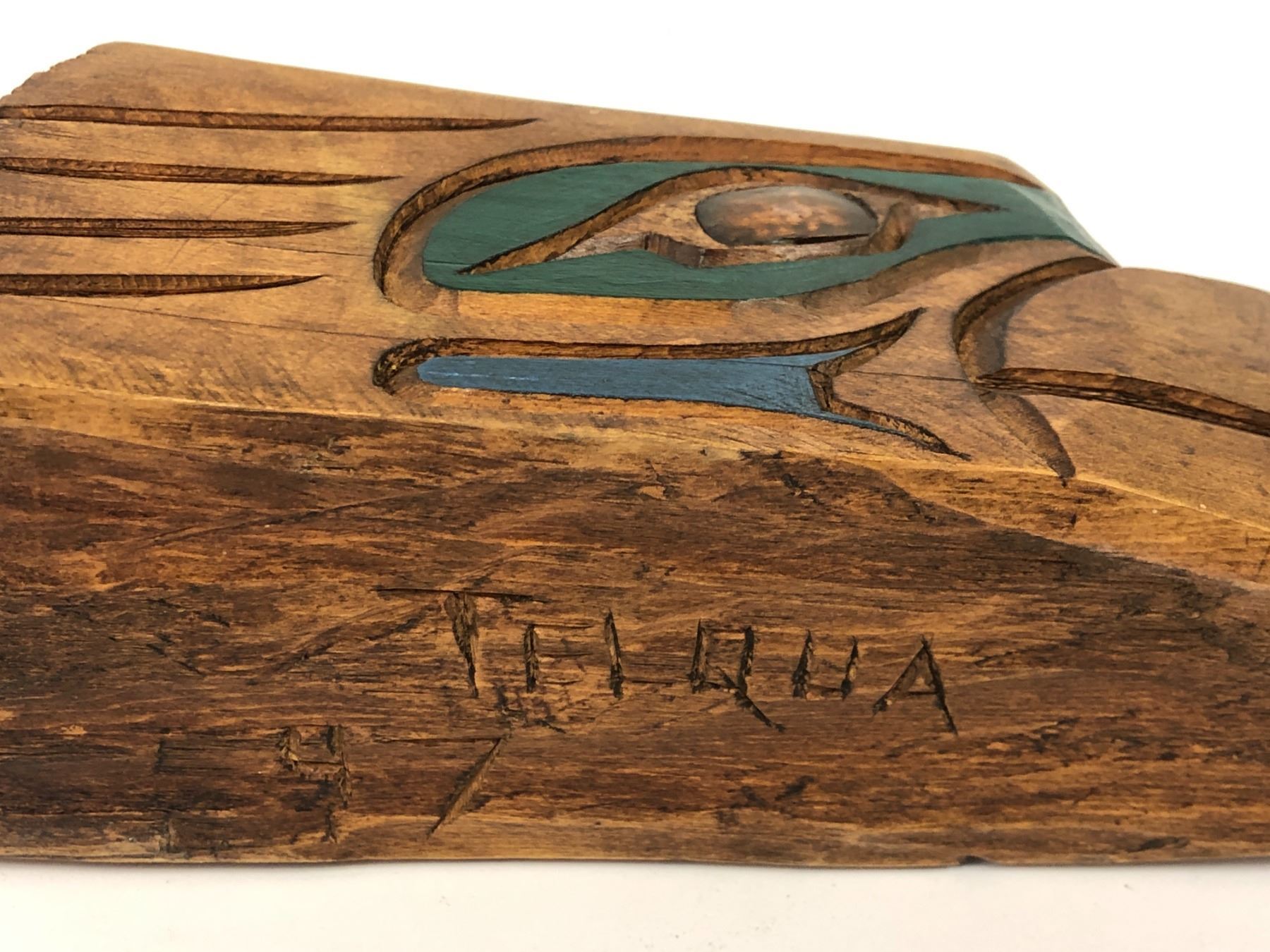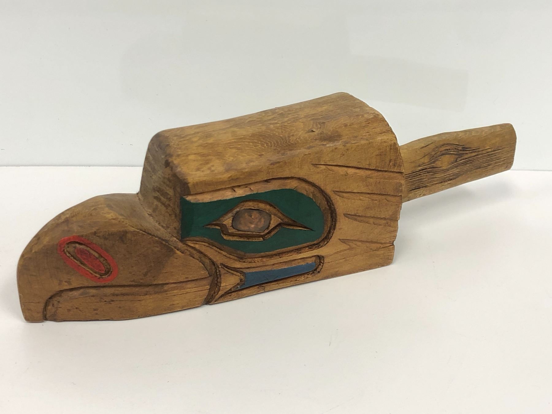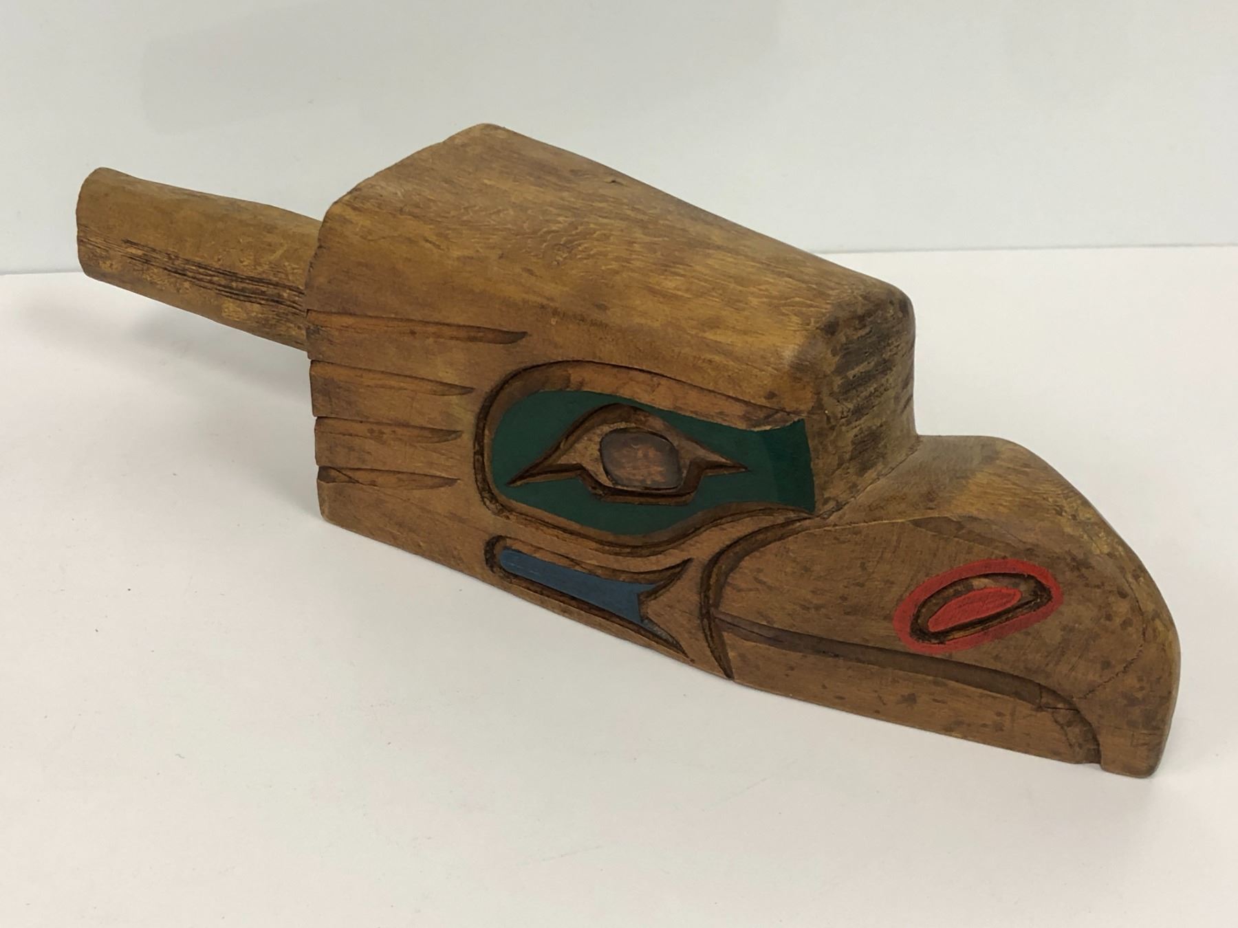 12in West Coast First Nations wood carved "Eagle" rattle w/ copper eyes signed Telqua 1997