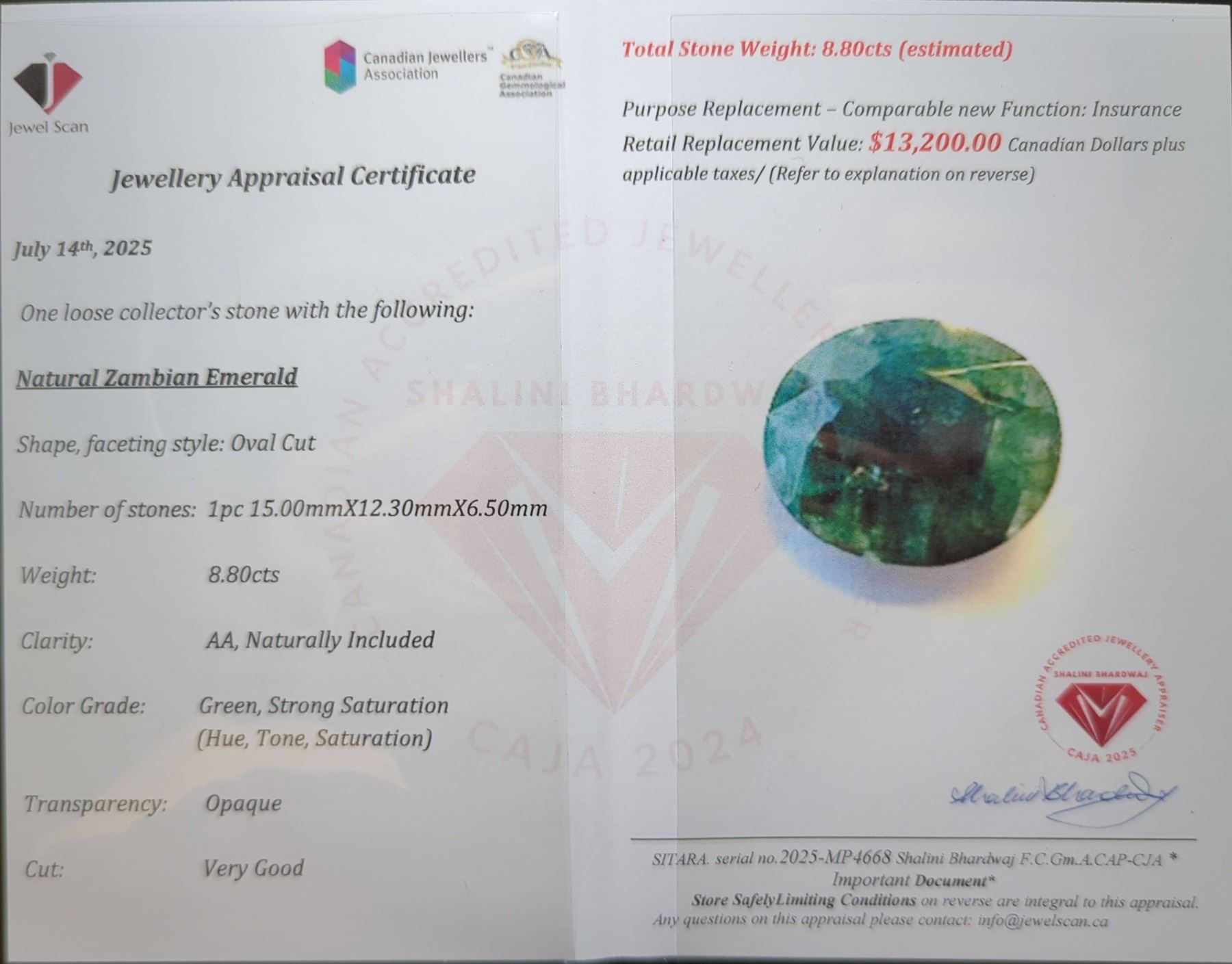 $13,200 Appraisal - 8.8 ct Cert. Emerald Gemstone