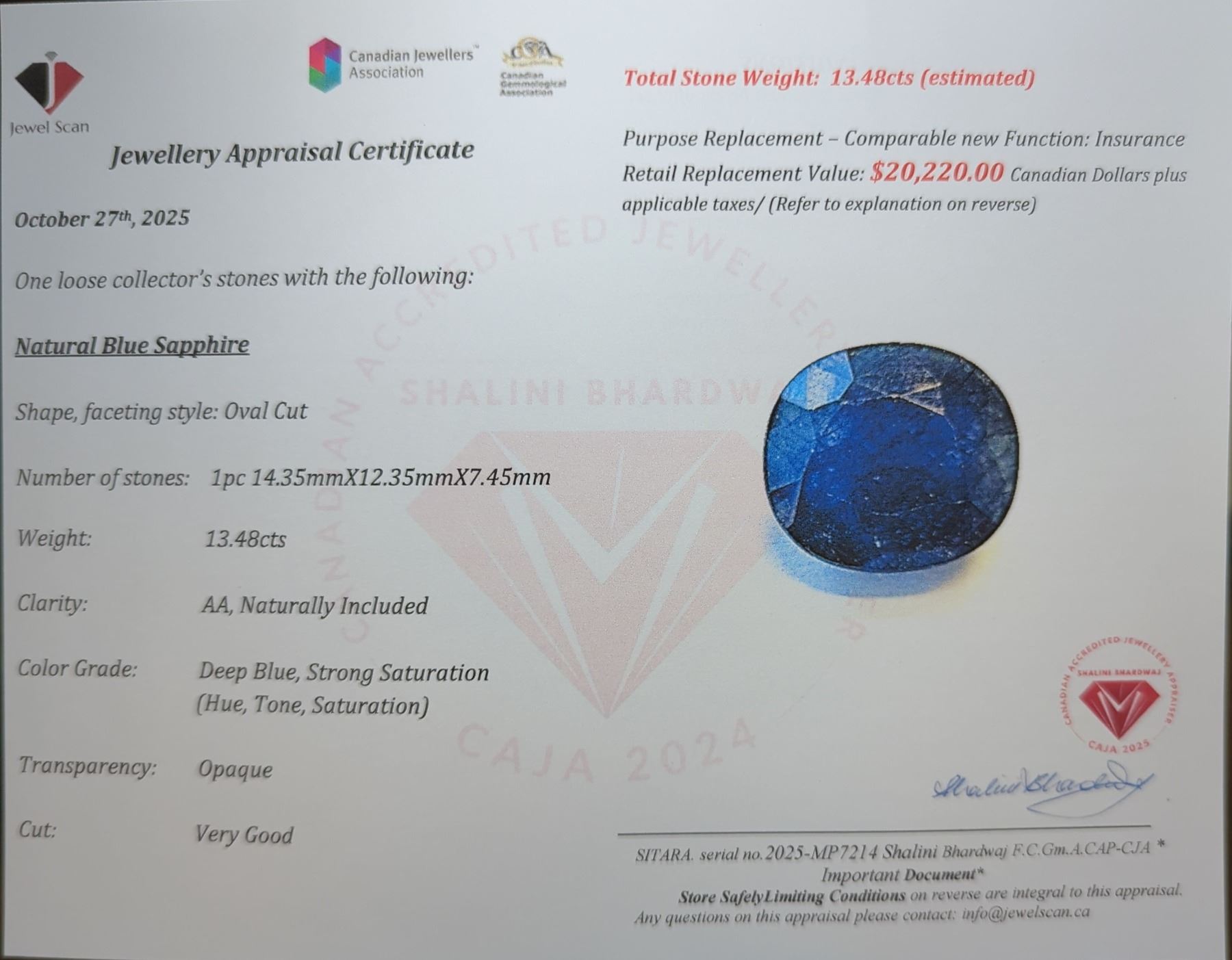 13.48 ct Certified Midnight Sapphire gemstone ($20,220 Appraisal)
