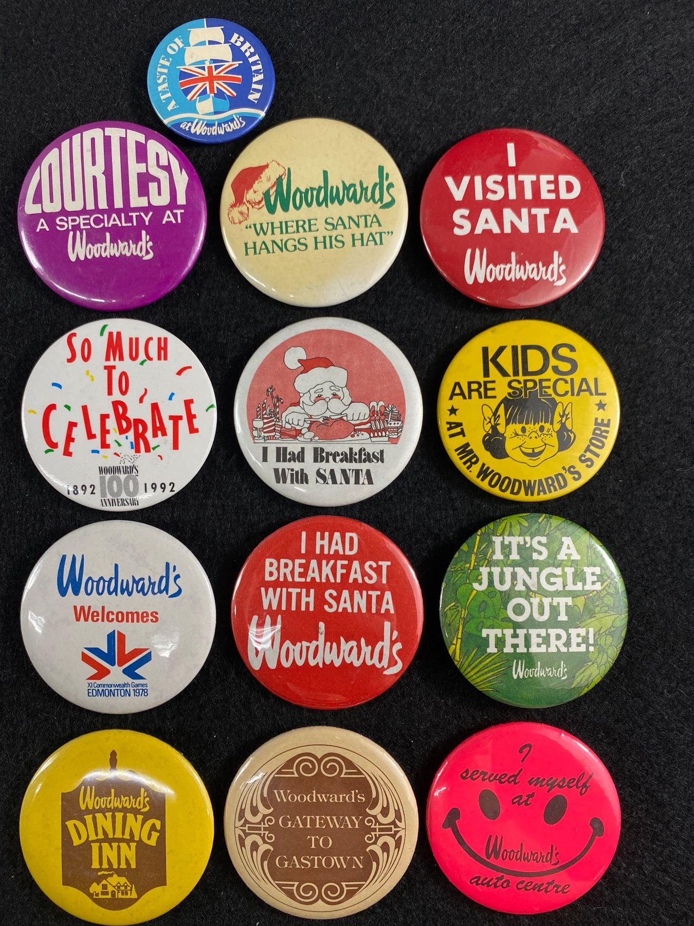 13 Various Vintage "Woodwards" Pins/Badges