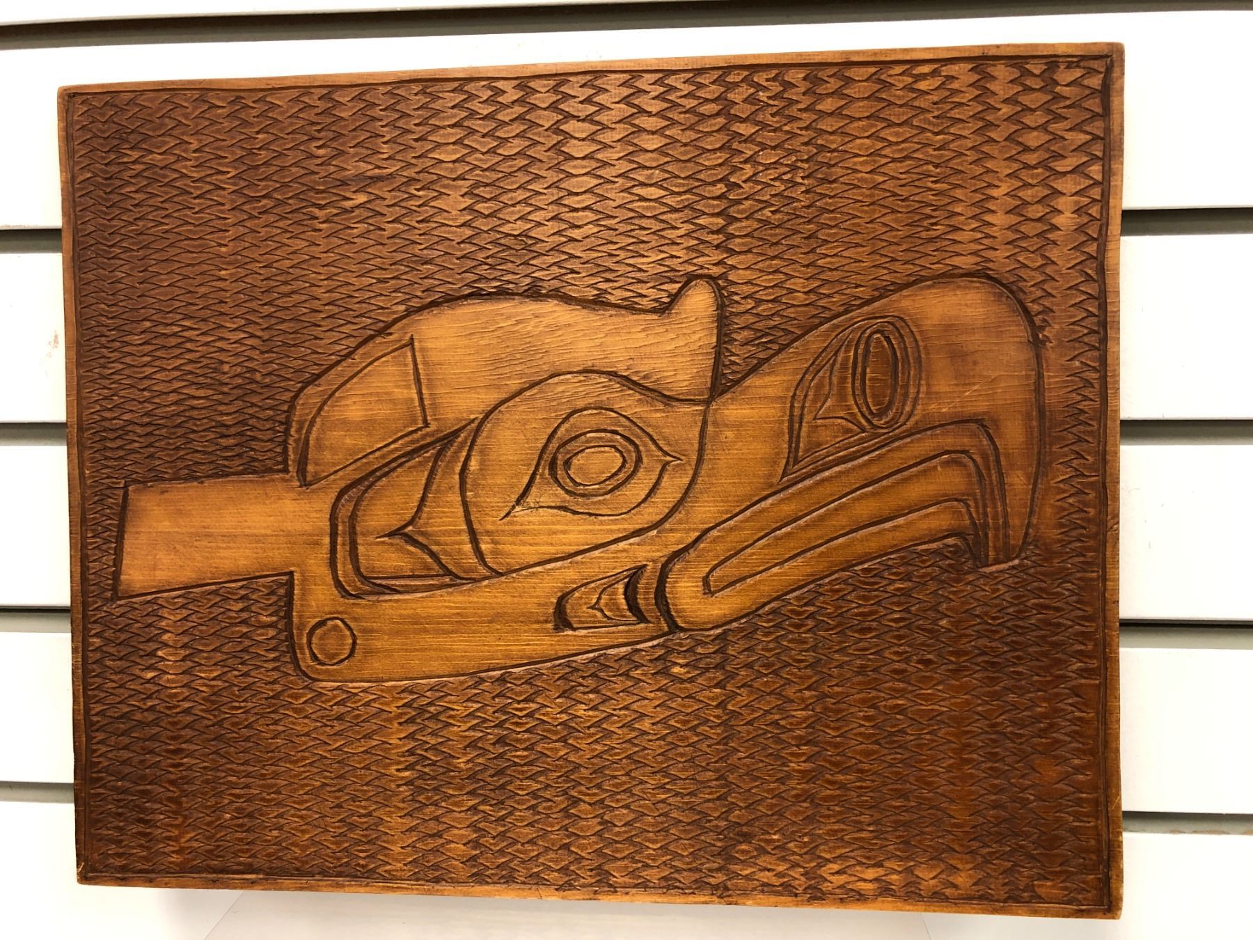 14 3/4in x 11 3/4in West Coast First Nations carved yellow cedar plank signed J Kelder