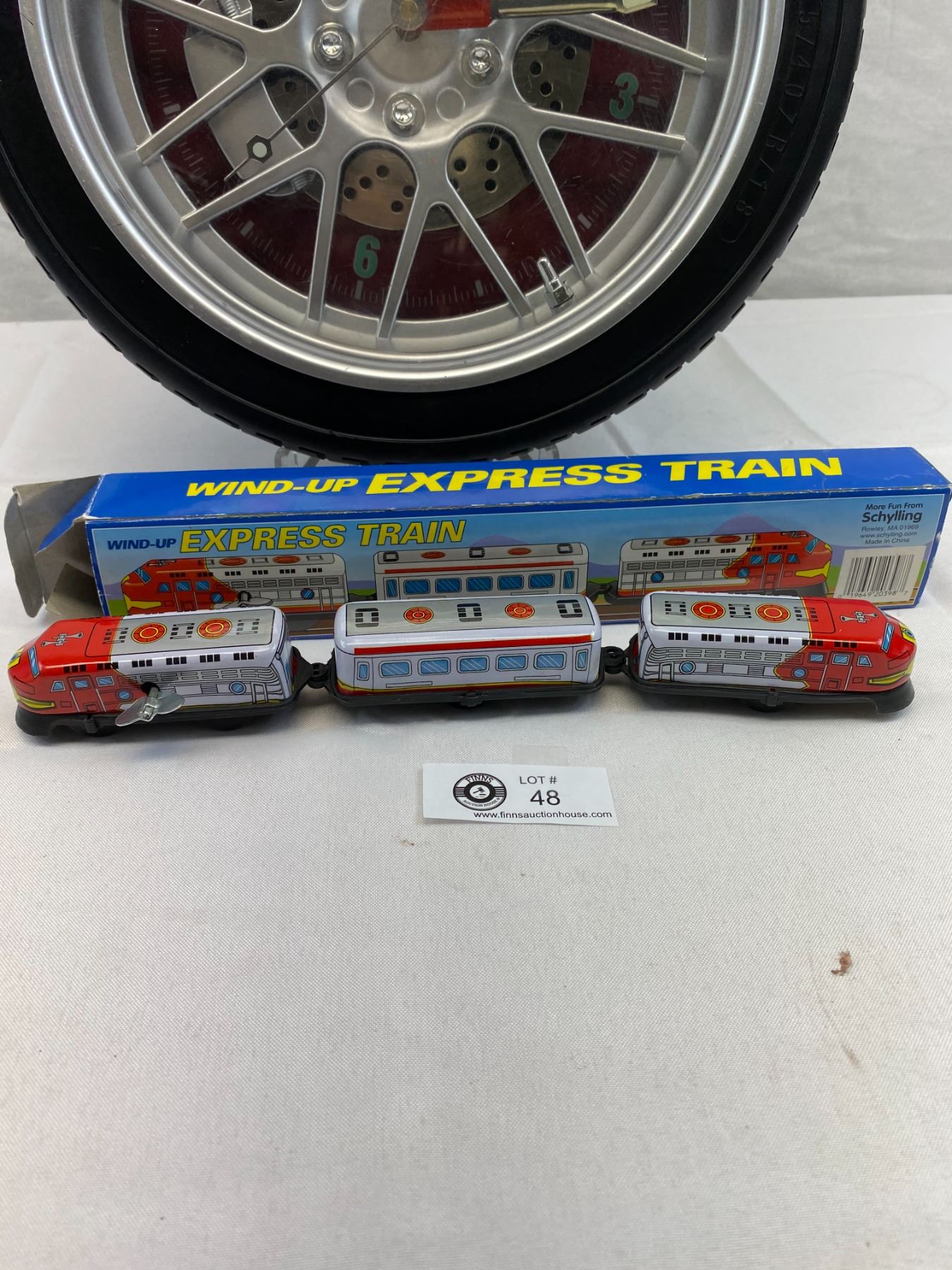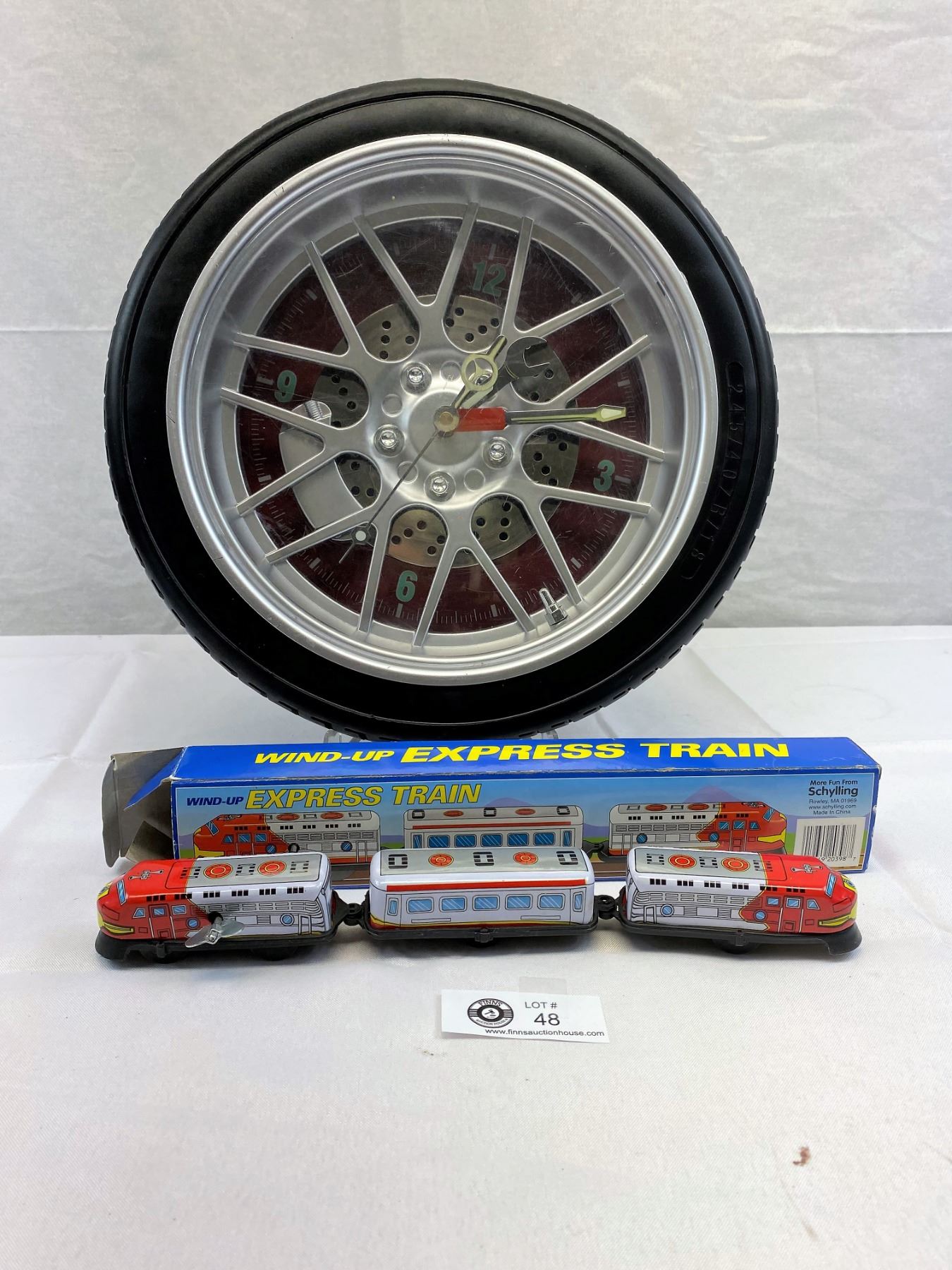 14" Car Tire Wall Clock, Working And 12.5" Wind-Up Schilling Express Train, New In Open Box