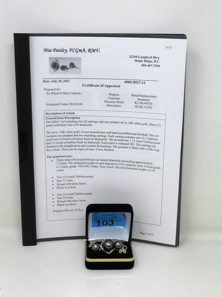 3 Tahitian Pearls. 39 VS1/VS2 Diamonds. Gemologist Appraisal for $5,210.